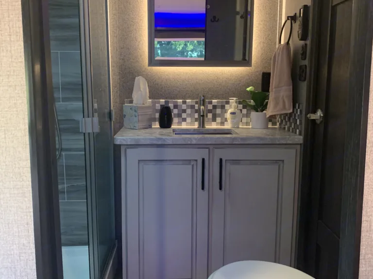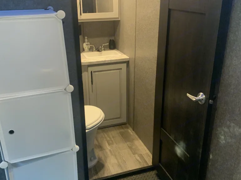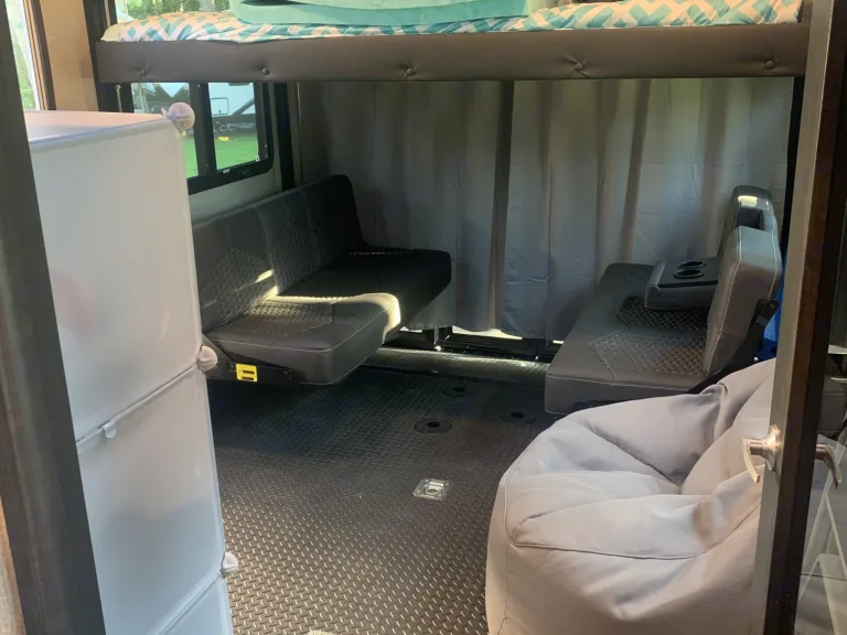 Glamping on wheels! Our 2021 Jayco Seismic 5th Wheel/Toy Hauler comes with all of the amenities you want while away from home! The kitchen is not like a typical RV, it has a full size stove that can cook a turkey and a residential fridge. There are tvs in every room, so there will not be any fighting over what to watch. All tvs are hooked up to Roku, so you can access all of your favorite shows! The master bedroom comes with a King size bed and plenty of storage. The bunk bed area actually has 2 twin beds set in a L Shape. There are two bathrooms in the rv, one full with even a teak seat, and a half bath in the garage/second bedroom. The garage portion of the toy hauler has 2 queen beds, which are perfect for the kids and friends to have sleepovers while having their own room. The bottom bed in the garage area also converts to 2 sofas that allow an indoor table set up. There is a built in mini fridge and grill off the side of the back.