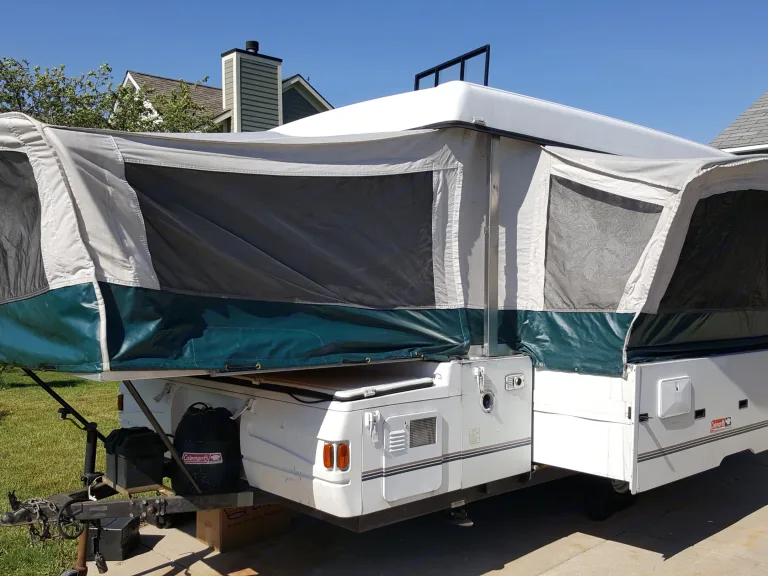 Great tent camper for a family. Queen bed on each side, plus additional sleeping space on the pull out couch and the fold down table. Screen room attaching to the awning expands your living space by double. This is a 3500lb. trailer, please consider your towing experience and tow vehicle before booking. Browse pictures for required connections, or contact me with questions.What's includedBasic Flatware, plates and bowls.