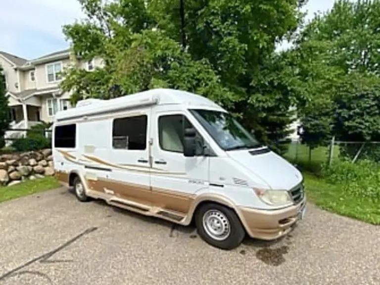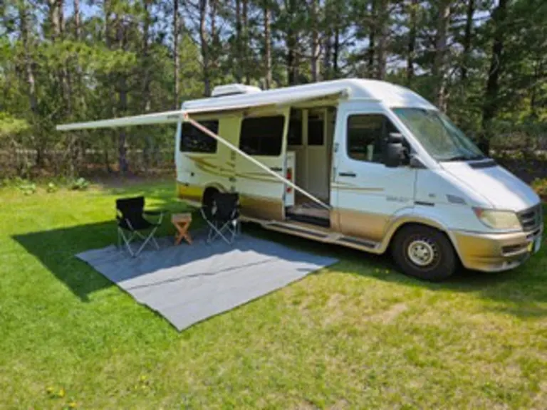 Great West Vans Legend. Sleeps 2 comfortably. Has couch seating area that turns into a bed, full kitchen and shower/bath, sink, stove, and microwave, brand new A/C with heat strip. Lots of storage and amazingly gets 22-24 miles to the gallon with the Mercedes 5 cylinder diesel engine.