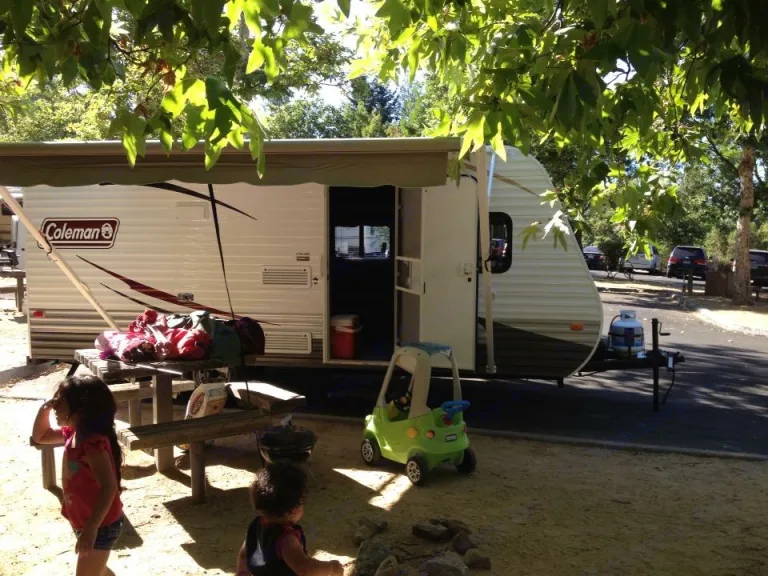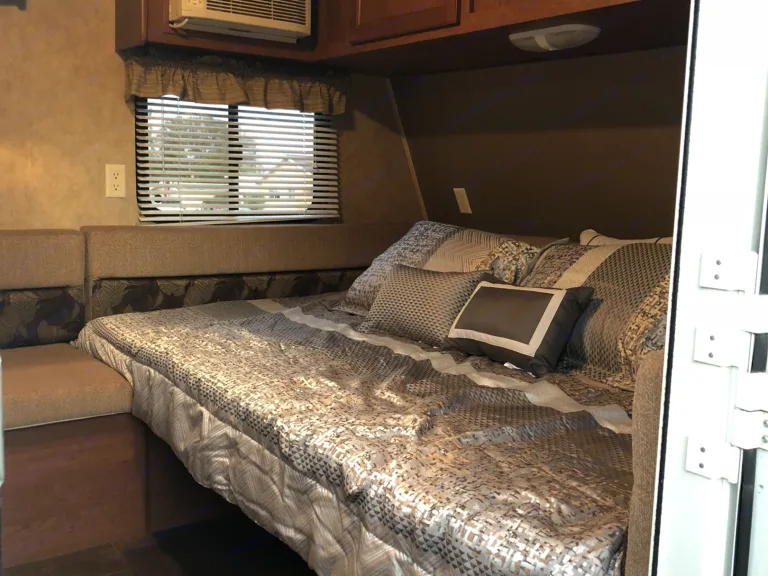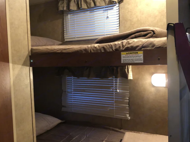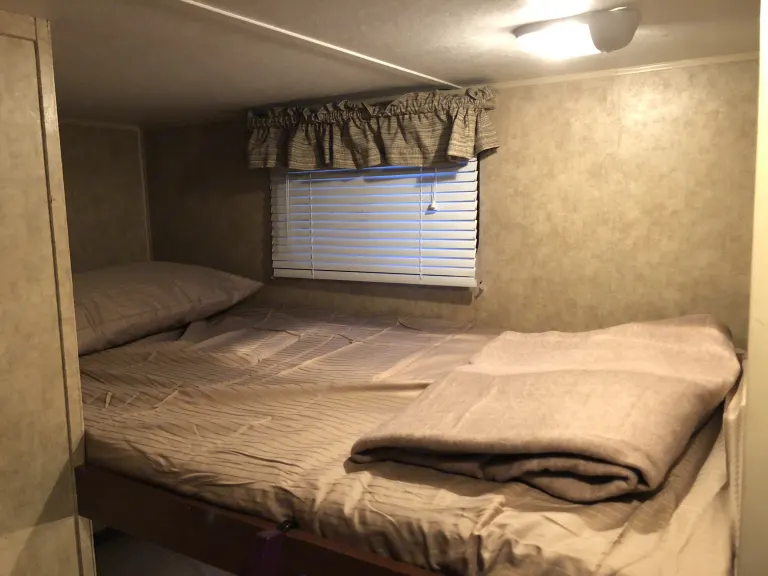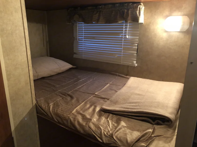 My camper is lightweight but very spacious and open. It weighs 3500 pounds and you could tow it with a V6 engine. It has a twin size bunk bed in the back and queen size bed upfront. It’s perfect for a family of six. My wife and I have six young children ranging from six months old to 12 years old and we fit comfortably in it.