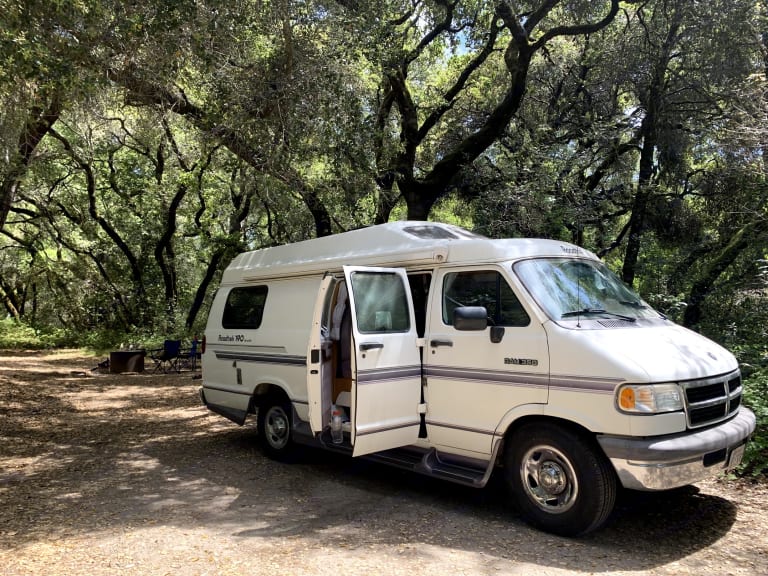 This old reliable 1994 Roadtrek has served me well through extended cross-country road trips and countless weekend trips alike. At 19 feet long, it's small enough to drive more like a van than a truck and fit in any tent spot, but large enough to stand up and move around in, store all your things, and sleep 4 (although it certainly is more comfortable for 2).It has a full kitchen with a microwave, propane stovetop and fridge; 4 seats in the cab, a convertible bed to table+benches in the back, and plenty of closet and storage space. A second back battery which charges when driving powers the lights, electric appliances, fan and AC unit. For longer stays, there's a cable for electric hookups. I also keep a set of the car camping basics you'd be free to use including camping chairs, a camp stove, pots, pans, utensils, and lanterns.It's built on a Dodge Ram 350 chassis, has 130k miles on it, and runs great mechanically after having put in a brand new transmission, alternator, and brakes within the past 2 years. It does not have 4wd however, so I'd ask you keep it off some of the stickier forest roads!This van is full of character and charm, and will surely serve as your trusty steed for any road trip you have in mind!What's included- 2 towels, 2 pillows, and bedsheets