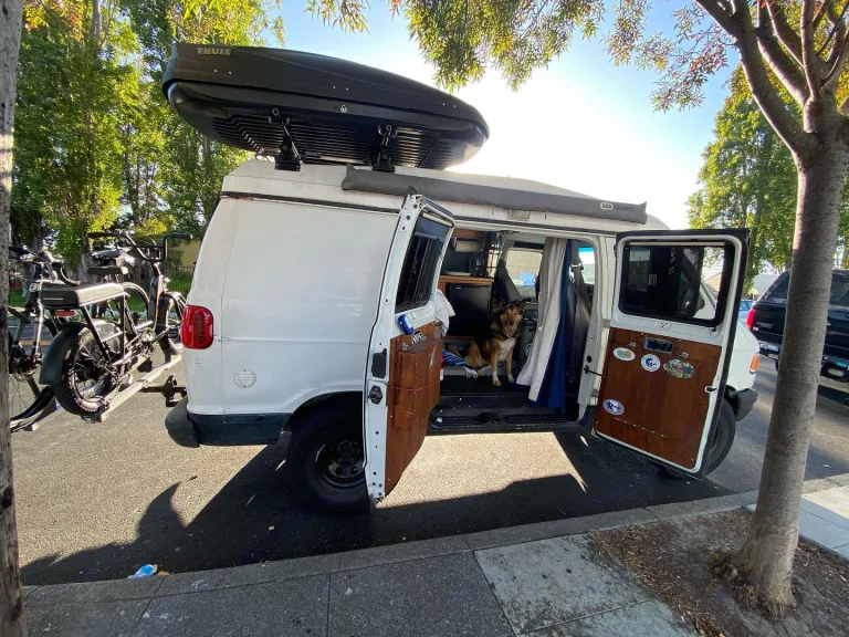ready for almost any adventure. It has a memory foam full mattress on a platform with lots of storage room below and a pull out extension for taller people that can also be used for a table or standing desk. There are lots of compartments and areas for storage to keep your items safe while in transit. There’s an auxiliary battery powered by the engine that provides power to the mini fridge, roof fan, vent, water pump and a power strip. This battery can also be charged by solar panels that are included.For RV sites there are external plug in and water hook-ups as well.Large awning and outdoor carpet square for base camp.Propane water heater, propane tank and shower head.The van has a back-up camera that's been added to help navigate blind spots.CD/AUX hookup and kenwood stereo with great sound