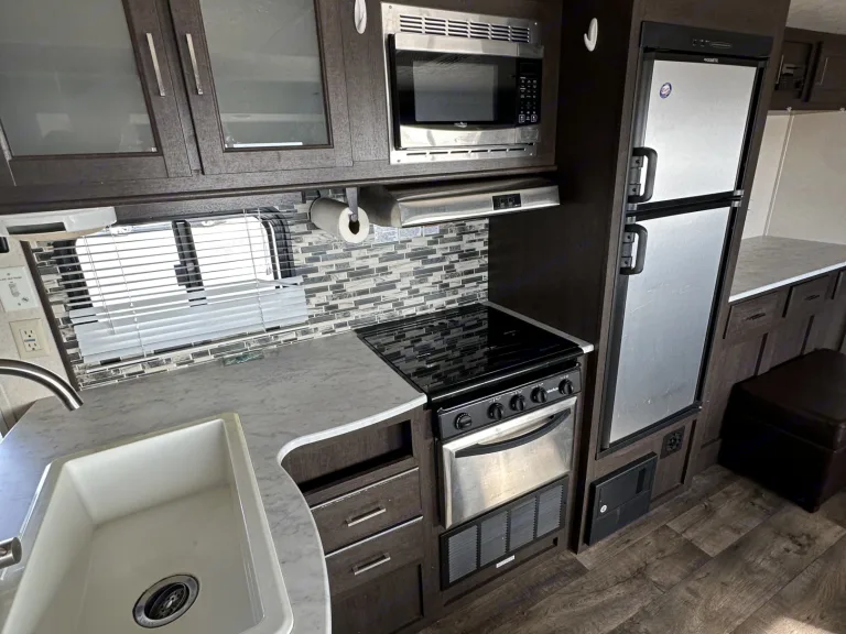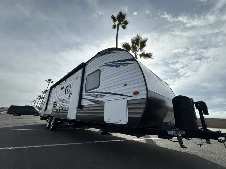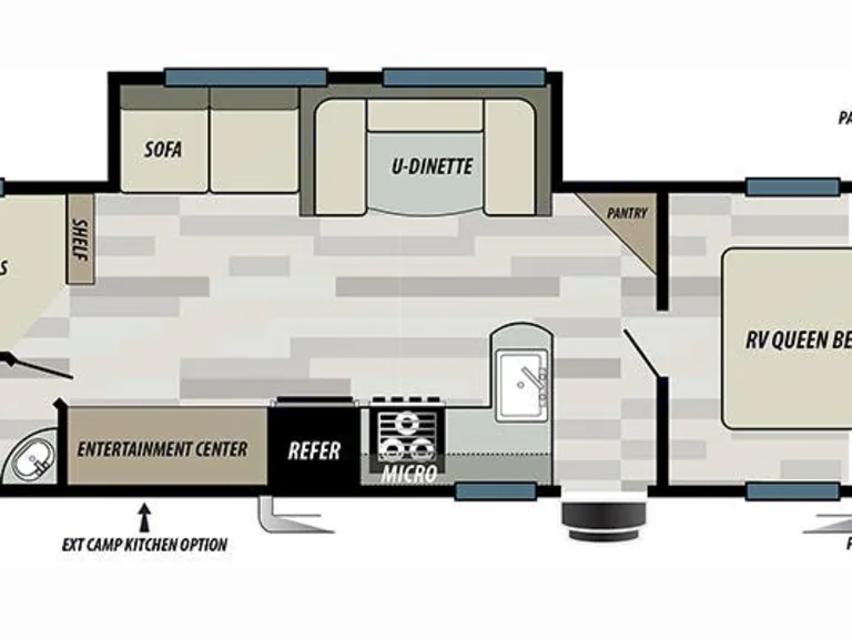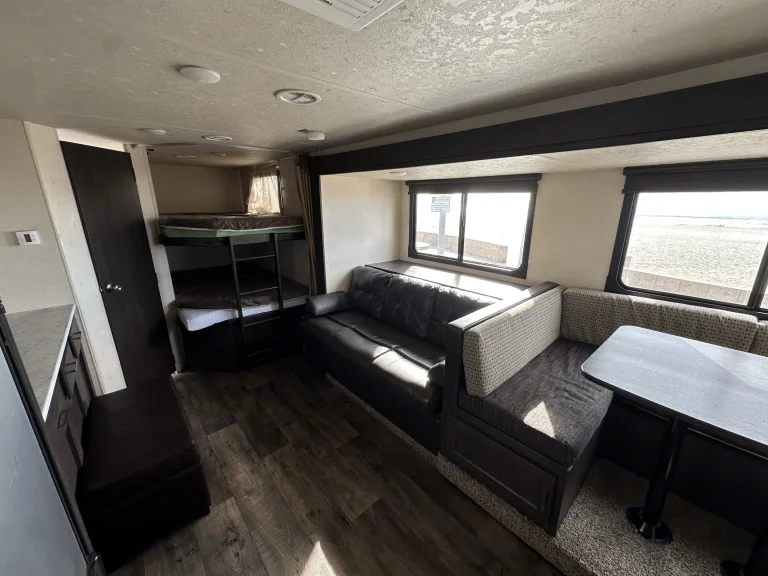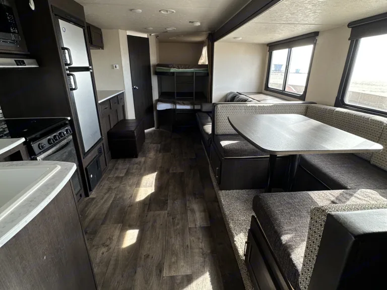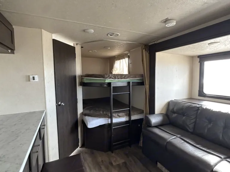 Leveling JacksLeveling Jack TypeFront Power / Rear PowerKitchen / Living AreaKitchen / Living Area Flooring TypeCarpet / VinylKitchen Table ConfigurationU-shaped DinetteKitchen LocationCenterLiving Area LocationCenterOven / StoveLayoutStoveNumber Of Oven Burners3Overhead FanYesRefrigeratorRefrigerator SizeMid-SizeRefrigerator Power ModeElectric / PropaneSofaNumber Of Sofas1Sofa MaterialClothReclining SofaNoRecliners / RockersNumber Of Recliner / Rockers0BedsMax Sleeping Count10Number Of Bunk Beds0Number Of Double Beds2Number Of Full Size Beds0Number Of Queen Size Beds1Number Of King Size Beds0Number Of Convertible / Sofa Beds2Master BedroomMaster Bedroom Flooring TypeVinylMaster Bedroom Door StyleConventional DoorFull Size Master Bedroom ClosetNoMaster Bedroom Mirror DoorsYesMaster Bedroom Shades / CurtainsYesMaster Bedroom LocationFrontBunkhouseYesBathroomNumber Of Bathrooms1Bathroom Flooring TypeVinylBathroom LocationRearToiletToilet TypePlasticToilet LocationRearShowerDoor TypeCurtainShower LocationRearBathtubBathtub LocationRearBathroom SinkBathroom Sink LocationRearBathroom Medicine CabinetBathroom Medicine Cabinet LocationRearBathroom MirrorBathroom Mirror LocationRearBathroom Vent / Fan SystemBathroom Vent / Fan System LocationRearWheelsWheels CompositionSteelNumber Of Axles2TiresRear Tire (Full Spec)15-InchSpare TireSpare Tire LocationExterior MountedBrakesFront Brake TypeNot ApplicableRear Brake TypeElectric DrumBatteryBattery Power ConverterYesPrewiringAir Conditioning PrewiringYesCable PrewiringYesPhone PrewiringNoHeat PrewiringYesTV Antenna PrewiringYesSatellite PrewiringYesWasher / Dryer PrewiringNoAir ConditioningAir Conditioning TypeAutomaticAir Conditioning13,500 BTUs*