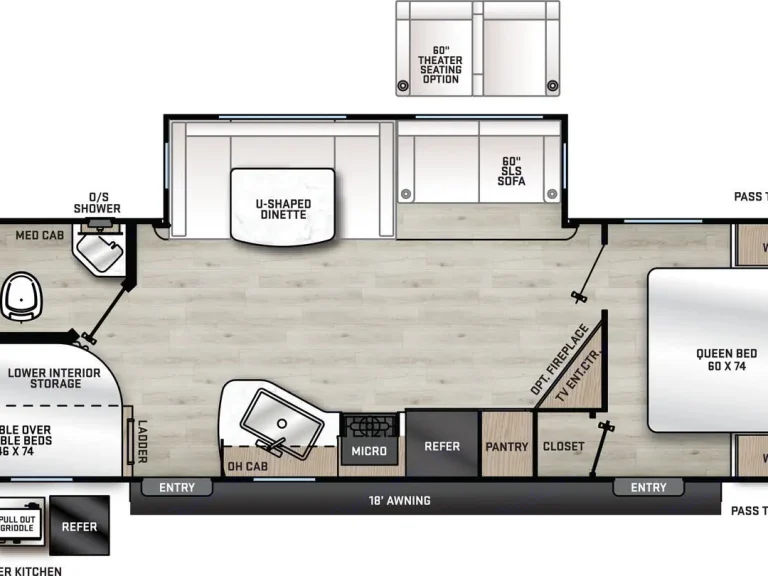 Exterior# Awnings1# Axles2# Doors2# Slides1ChassisNorco Electromagnetic, Powder Coated ChassisHitchBumper PullElectrical# A/C1A/C SpecGE 13,500 BTU Fully Ducted A/C with Heat Pump