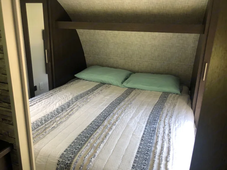 This still-new high end rig is perfect for Glamping (or camping)! Upgraded queen mattress in master bedroom ensures a great night’s sleep. 3 beds in a separate back bunk room, plus the additional option to sleep three more in the living room. Outdoor kitchen with fridge, stove top, sink and attached grill is great for beer, BBQ and much more. A/C and heat ensure a perfect temperature inside at all times. Indoor fireplace is perfect to snuggle up to on rainy camping nights. Hot water heater is beyond amazing. Tons of storage space underneath for all of your adventure gear! Power level and power stabilization legs make set up a breeze. Up to 7700lbs fully loaded.See our model on display at a National RV show.