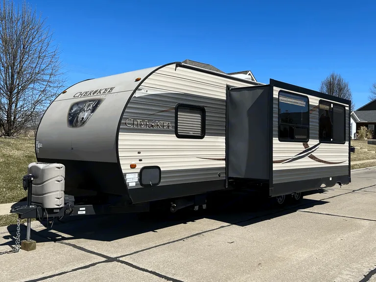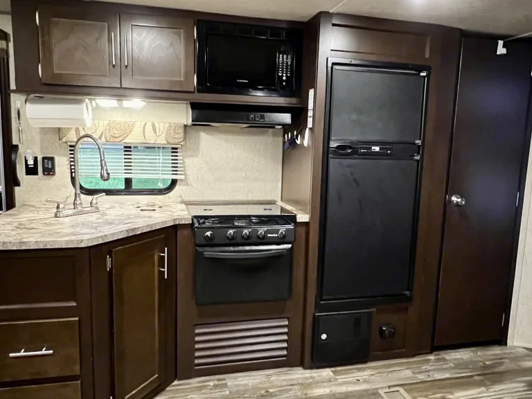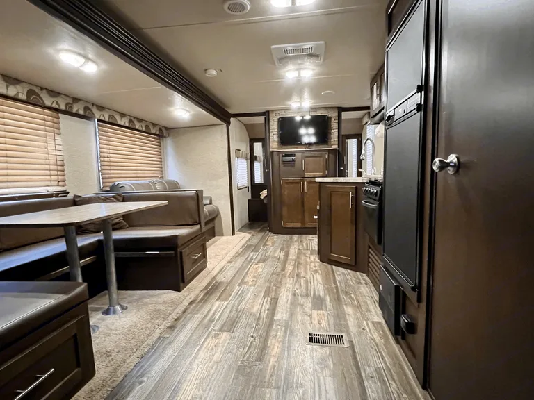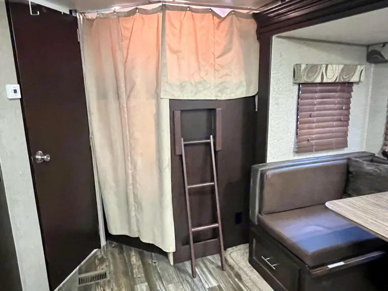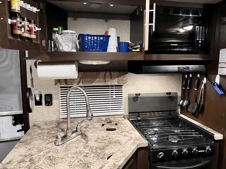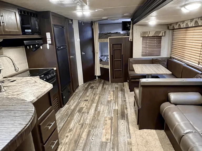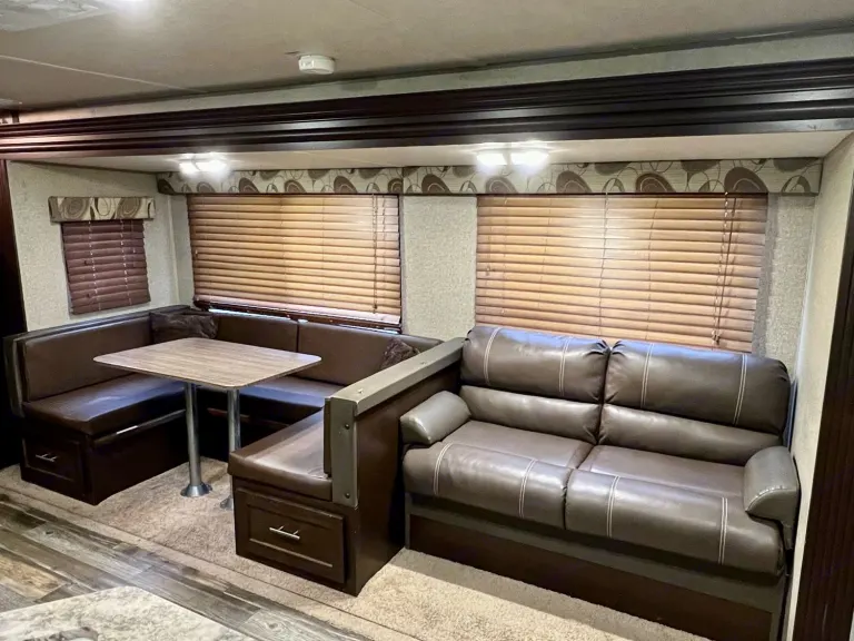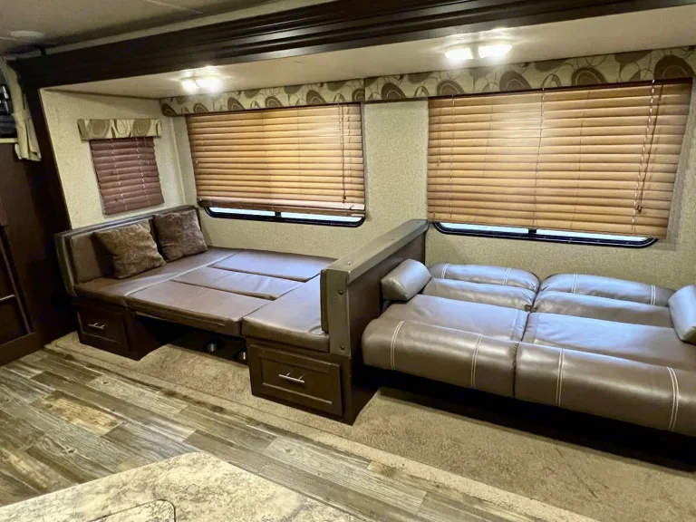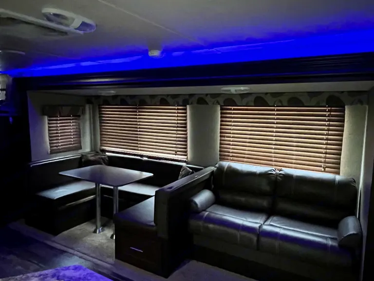 The dinette and love seat (jack-knife couch) both convert into beds for additional sleeping space.You will find a few board games in our trailer incase of a rainy day.Cookware, camping chairs, skewers for marshmallows around a fire, bowls, plates, cups, utensils. The oven has a pizza stone to throw in a frozen pizza for a quick meal. Microwave, Bar-B-Q grill set (no grill), Kuerig coffee machine & an electric water kettle for oatmeal in the morning. You will find 3 DVD players in the camper so be sure to bring your favorite movies. Connect our Smart TV to your HotSpot and watch your favorite game.DON'T Forget to bring: Charcoal, food & your favorite DVD movies.Our camper comes with a LevelMate PRO to help level the camper for a comfortable stay. Download the LevelMate PRO app. See video link: https://www.youtube.com/watch?v=L4C3AgndFG4 for more information.For a more in-depth look at our camper, here is a video link of an identical camper: https://www.youtube.com/watch?v=xgY5ZJ1Nst0Camp Site Booking Considerations: