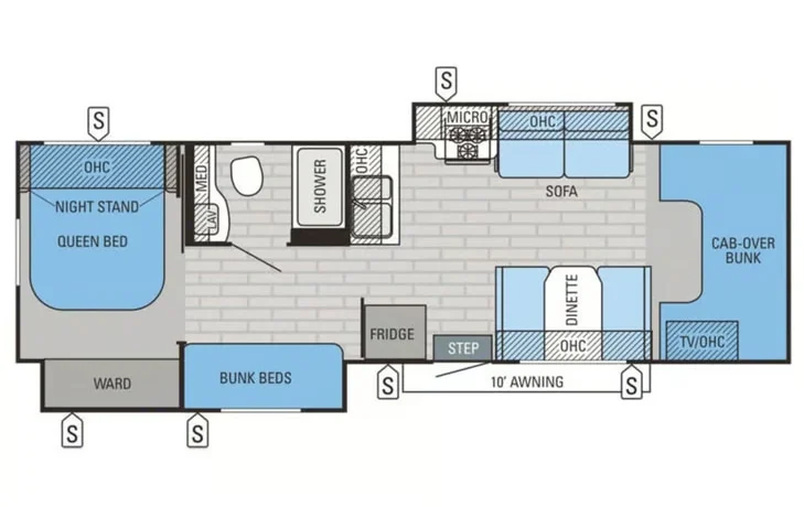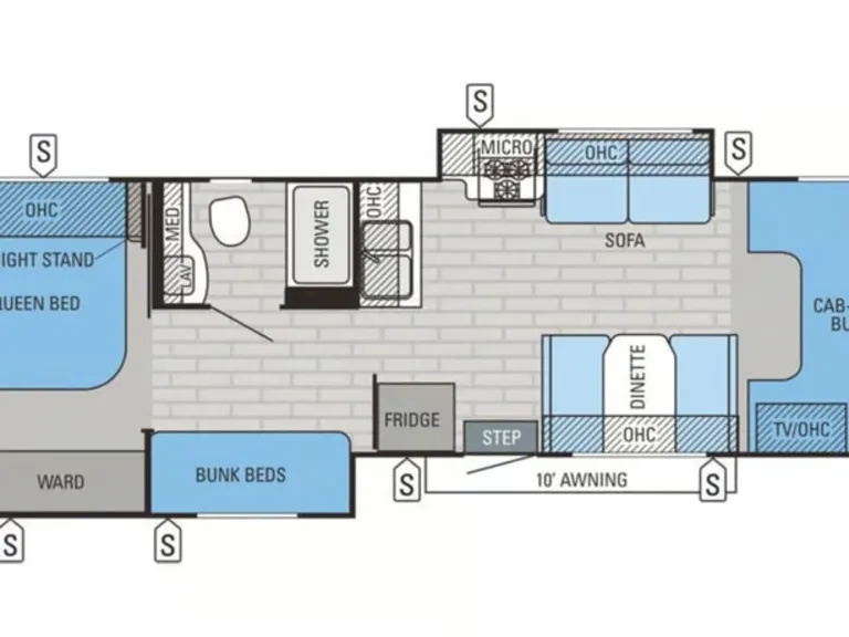 Outside, you’ll appreciate the ease of the electric awning. Perfect for morning coffee, evening meals, or relaxing after a day of adventure. This Greyhawk is easy to drive and maneuver, even for first-time RV travelers.What TO Bring: