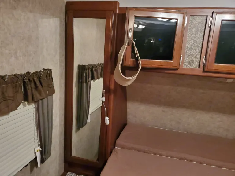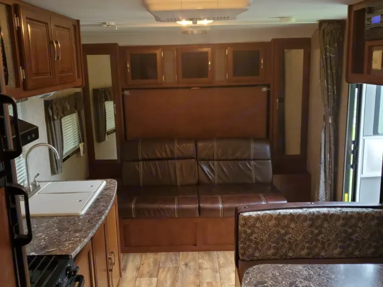 This rig is fully equipped with a queen-size Murphy bed, bunk beds, and dinette that converts to a bed; full bath with shower/tub, stove, oven, microwave, refrigerator, and lots of storage!