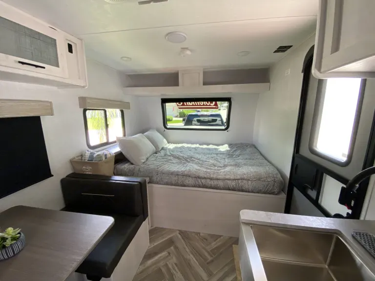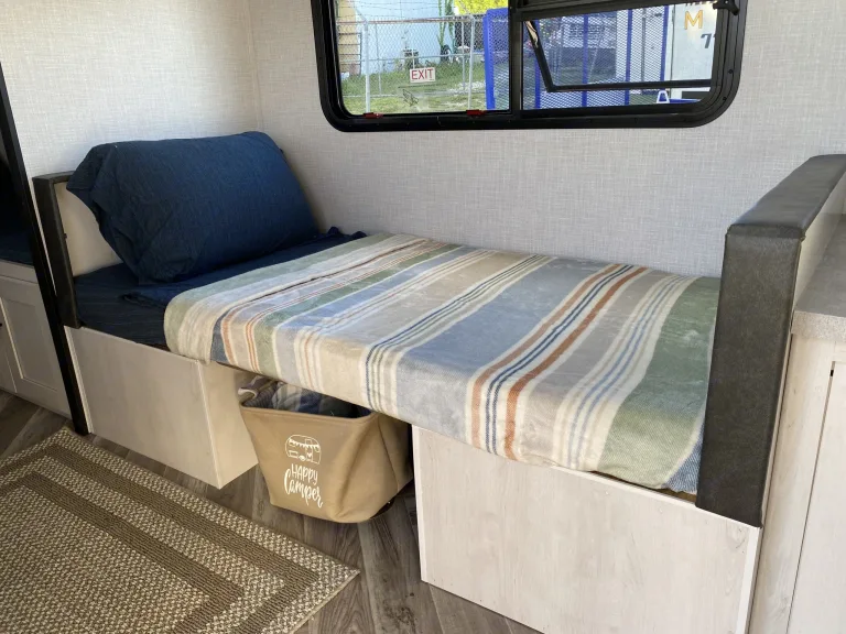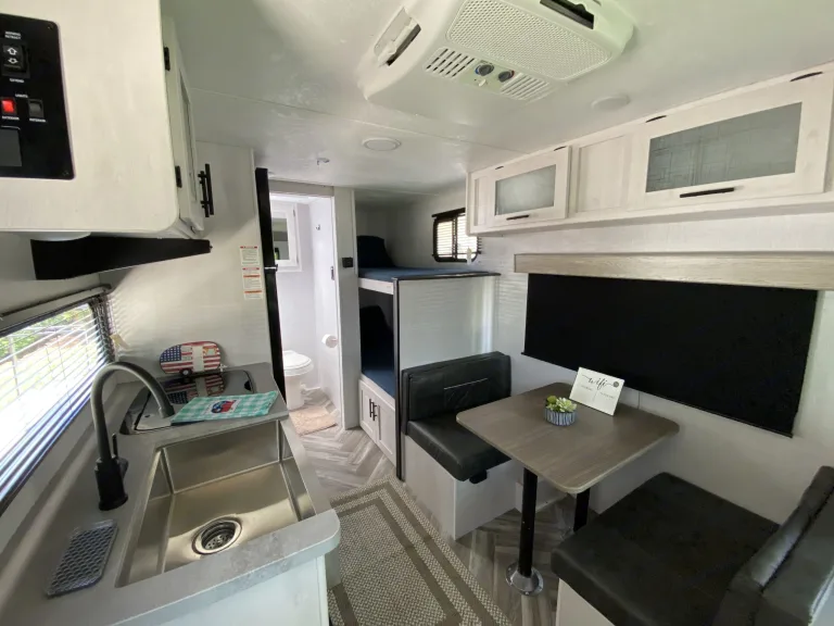 The open living area is thoughtfully designed to maximize space and comfort. A front queen bed provides a cozy retreat, while rear bunk beds are perfect for kids or extra guests. The convertible dinette offers flexible seating for meals and easily transforms into additional sleeping space. With climate control throughout, you’ll stay cool and comfortable even in the Florida heat.Kitchen: