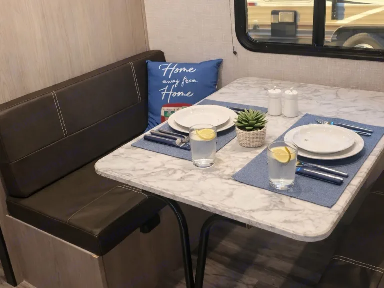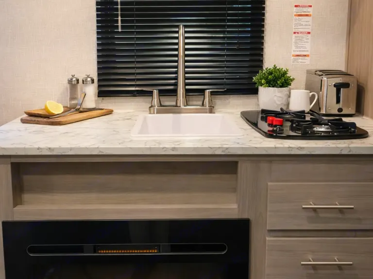 The fully equipped kitchen makes meals on the road easy and convenient. You’ll enjoy, a 2-burner cooktop, Microwave, Refrigerator, and Sink. Miami also comes fully stocked with pots, pans, dishes, silverware, utensils, a coffee maker, and cleaning supplies, so you can focus on enjoying your trip instead of packing extras.Bathroom:
