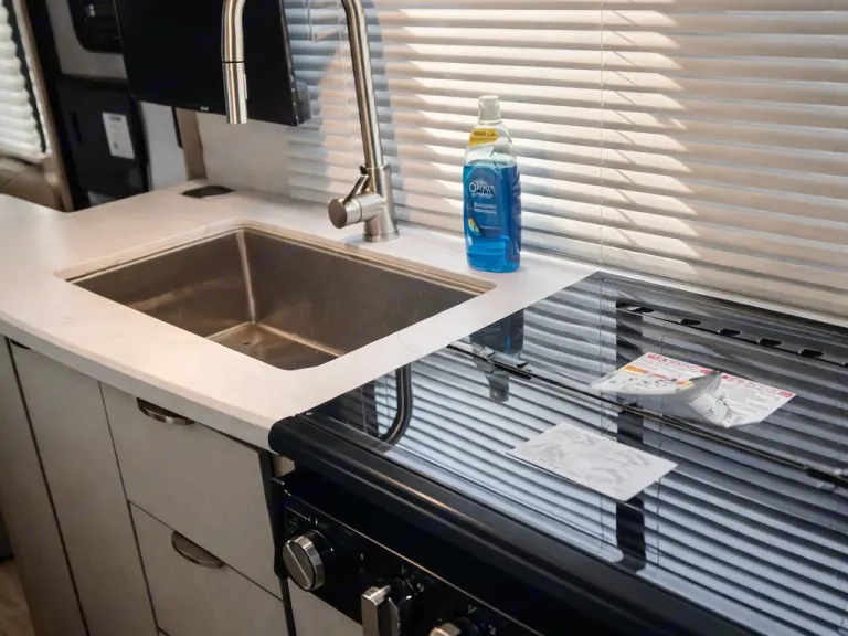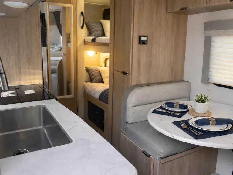 The inviting living space is designed to be both functional and comfortable. Additional sleeping comes from bunk beds, a convertible dinette and queen bed in the common area.Kitchen: