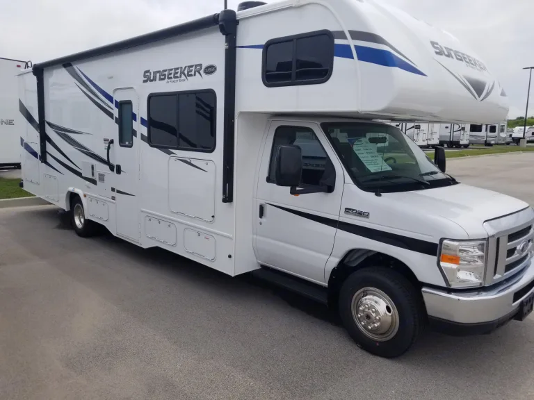 The Sunseeker 3050 is a spacious RV with all the amenities. Outdoor TV and Speaker System with Lighted and powered awning for easy setup. This coach comes equipped with an automatic leveling system which means your coach will feel more stable and more like a home when set up at your campsite. The kitchen is outfitted with a 12 volt 10.7 cu ft stainless steel fridge, 3 burner gas stove top, and a convection oven microwave. Our couch has multiple usb charge ports throughout the interior along with a wireless charger for compatible phones. The Bedroom features a queen size bed and two large wardrobe closets. This coach can sleep up to 8 people. Two in the bunk loft (not to exceed 500 lbs), Two on the convertible couch and two on the bed/dinette. You can safely travel with a total of 7 people buckled in. The Sunseeker features two large skylights that let in ample daylight making the coach feel even larger.Green Power- Our Sunseeker coach is equipped with a solar panel on the roof to keep the on-board battery charged. There is an easy to view charge controller to let you know the status of your batteries. Less generator usage means less noise.First in Safety-