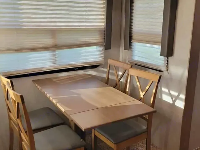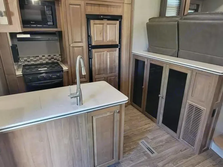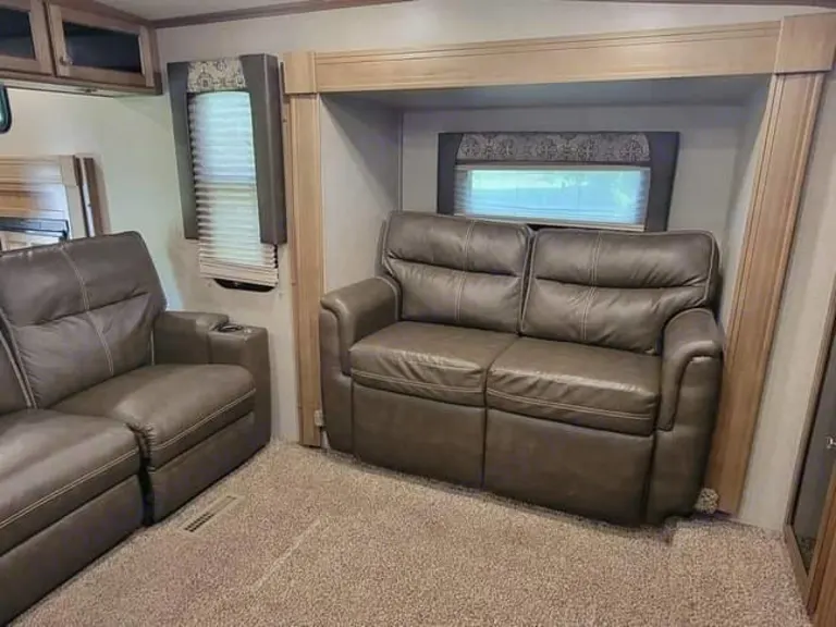 Spacious Fifth Wheel Camper - Your Cozy UP Retreat!Step into comfort and relaxation with this beautifully designed fifth-wheel camper- perfect for families, couples or anyone looking to explore the Upper Peninsula in style. With a warm, modern interior, and a smart split-level layout, this camper feels more like a tiny home than an RV. This spacious camper sleeps 4 people but can sleep six with the queen size bed in the private master bedroom, twin size pullout couch and two very comfy recliners.- Main Living Area -