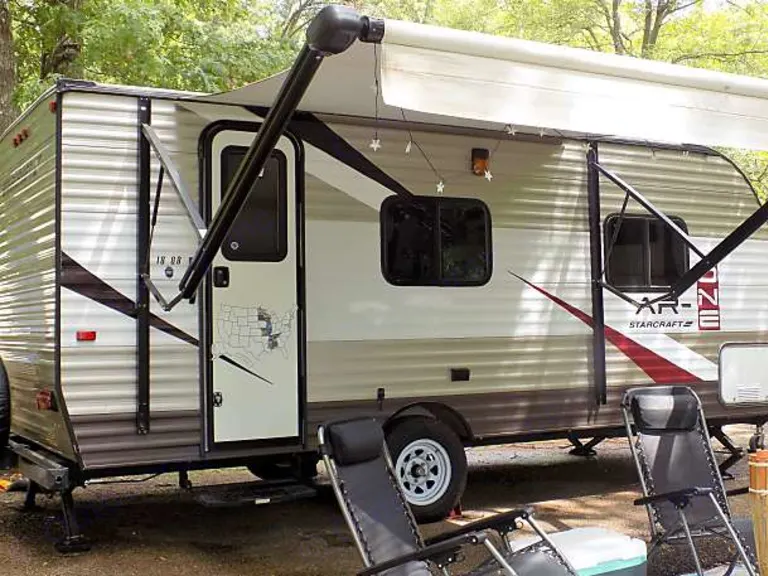 Leave reality in the cosmic dust as you travel through the cosmos in our aptly named Little Dipper! This Starcraft AR-ONE 18 QB travel trailer has everything you need to enjoy spending time away from home. As you enter notice the roomy wardrobe to your left. Straight ahead in the rear drivers side corner there is a private toilet and tub/shower. Just outside the bathroom door is a TV area above a pantry for dry and canned good storage. An L-sofa with dining table and overhead cabinet can be found to your right when you enter and features plenty of seating for mealtime and more. Straight across from the sofa you will find a two burner cook-top with microwave oven overhead, a single sink and counter space, plus storage both above and below the counter. The front of this AR-ONE features a walk-around queen size bed with dual bedside wardrobes, an overhead shelf, and a privacy will also enjoy the front passenger side storage, and a 13' Electric awning which creates a covered living area outside to enjoy. You'll return rested, with stars in your eyes and 5* reviews!