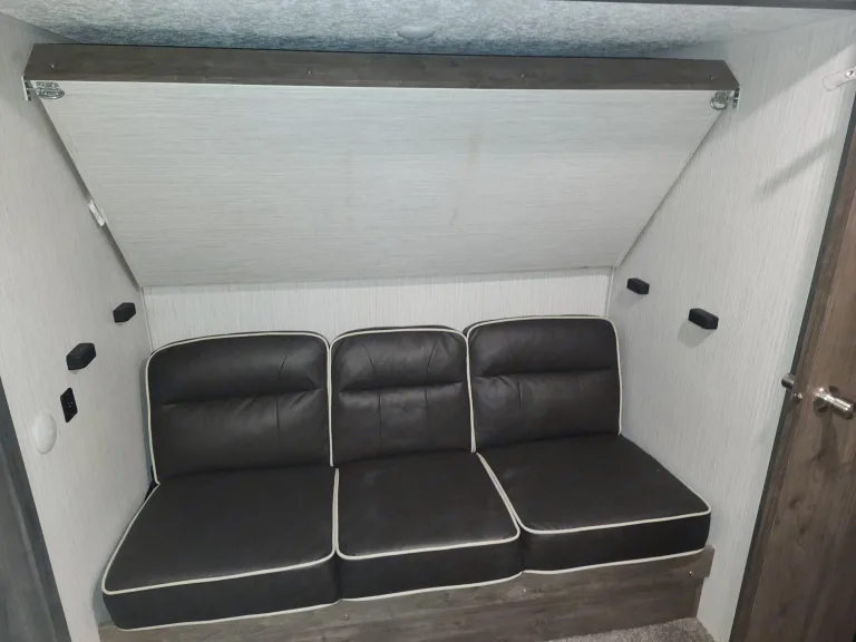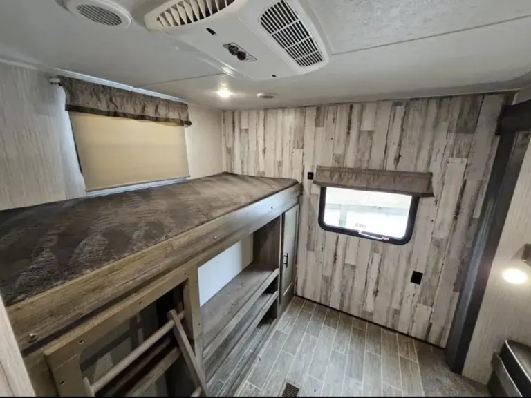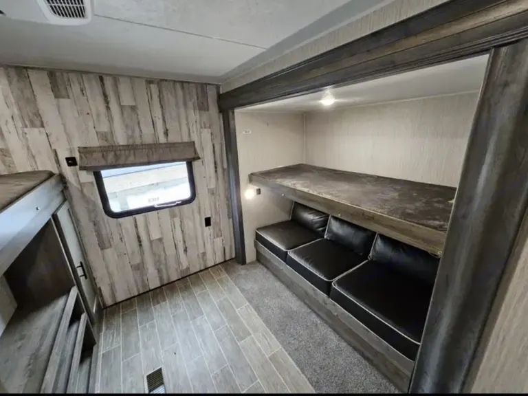 Sleeping Capacity: Sleeps up to 10 people comfortably, making it ideal for large families or groups. The layout includes a master bedroom, a set of bunk beds, a dinette that converts into a bed, and a sofa that doubles as a sleeping area.Kitchen: Fully equipped with a three-burner gas stove, oven, microwave, refrigerator, and plenty of counter space for meal preparation. The kitchen area also features ample cabinetry for storage.Living Area: The spacious living area features comfortable seating, including a sofa and a U-shaped dinette, both of which can convert into beds. The entertainment center houses a large TV and multimedia options for cozy nights in.Bathroom: Includes a full bath with a shower, toilet, and sink, providing privacy and convenience for all travelers.Additional Features: