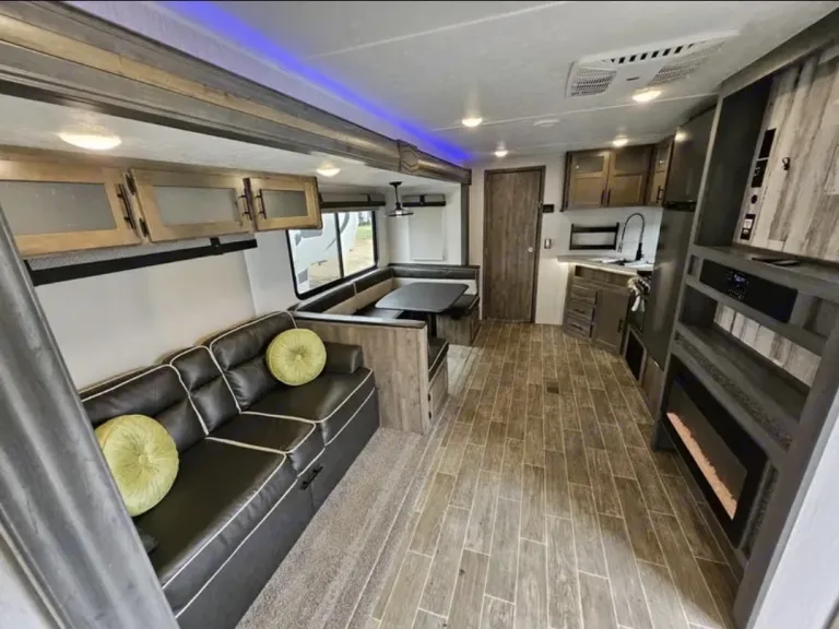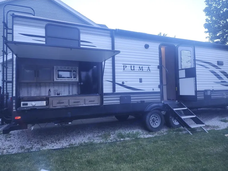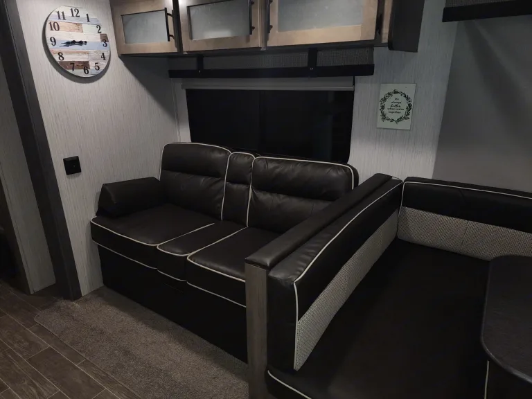 Length: Approximately 35 feet in total, making it spacious yet manageable for towing.Construction: Built with a sturdy steel frame and durable laminated sidewalls to withstand the rigors of travel.Power Awning: Comes with an adjustable, oversized power awning for shade and relaxation at campgrounds.Outdoor Speakers: Equipped with outdoor speakers for entertainment under the awning.Storage: Includes generous exterior storage compartments, perfect for stowing gear and camping essentials.Interior: