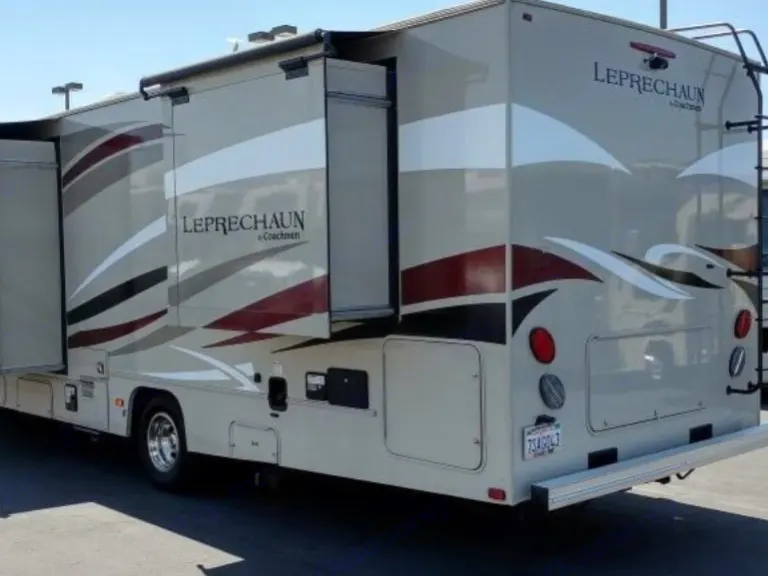 31ft. Coachmen Leprechaun features Queen Bedroom, Dinette Bed, Sofa Sleeper, Overhead Bed, Microwave, Oven, and stove top!