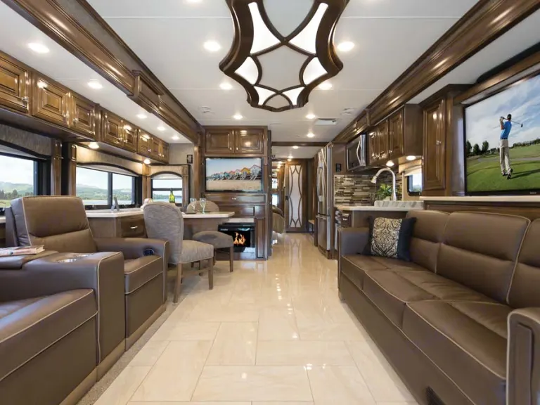 THE RV. 4 Flat Screens. 1 Outside. A 55 Inch Flat Screen TV Sits ON A Fireplace. With AN IN Motion Satellite. AND Surround Sound System.. 4 Beds, 1 King, 1 Queen, 2 Twins..2 Bathrooms, A Fully Equipped Kitchen With A Dishwasher, Microwave, Convection Oven, Dishes Silverware Pots AND Pans. Belgium Waffle Maker, Commercial Blender, Mixer AND DON'T Forget THE Kuerig. YES Even A Clothes Washer AND Dryer.