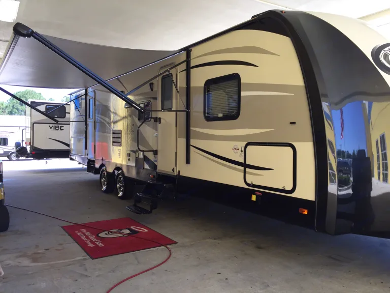 2015 Forest River Vibe Bunkhouse Travel Trailer. Front master bedroom, center kitchen living room and bath. Rear bunkhouse with 3 beds. Sleeps up to 9 total.