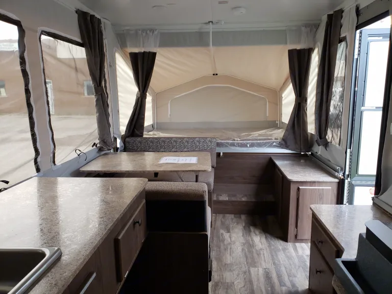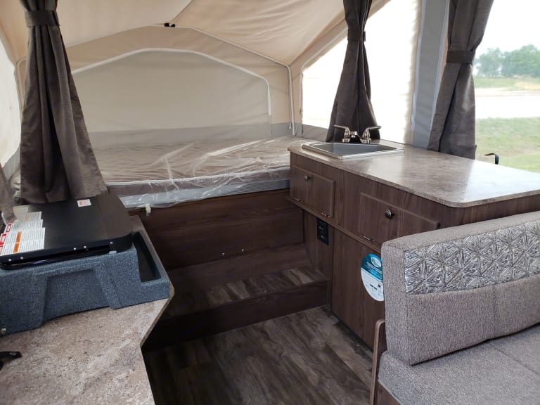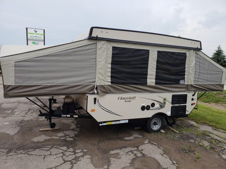 The 2018 Flagstaff Mac light 10 foot tent trailer is perfect for you getaway. It comes loaded with Fridge, furnace, sink, indoor/outdoor stove top connected to propane tank. It sleeps 5 comfortably but could potentially sleep 6. Very lightweight and easy to drive! Attach to a 2 inch ball and 7 prong adapter and you ready to go. Serviced 3 times a year to ensure safety. Also has racks on top to bring your bikes!