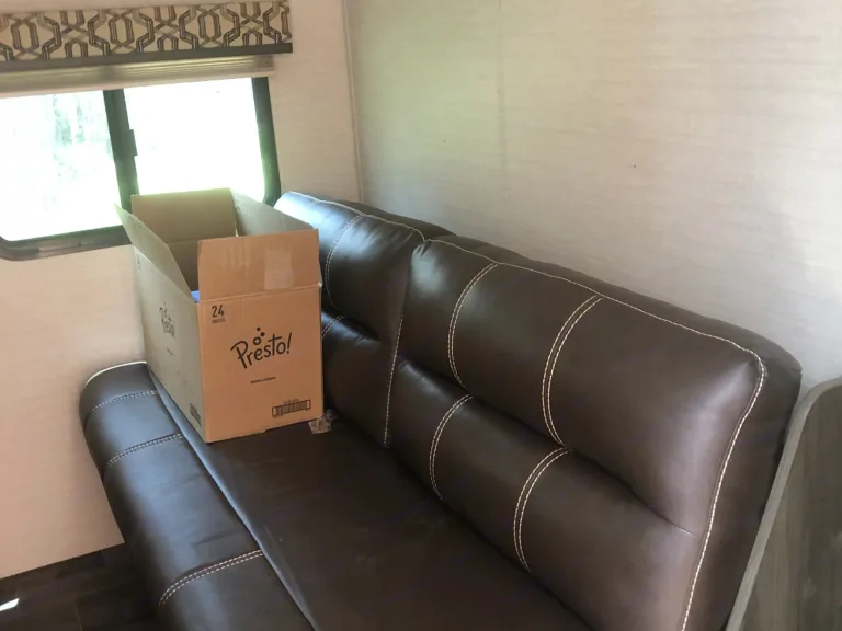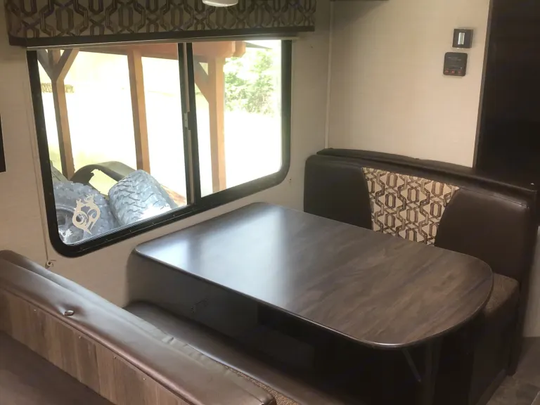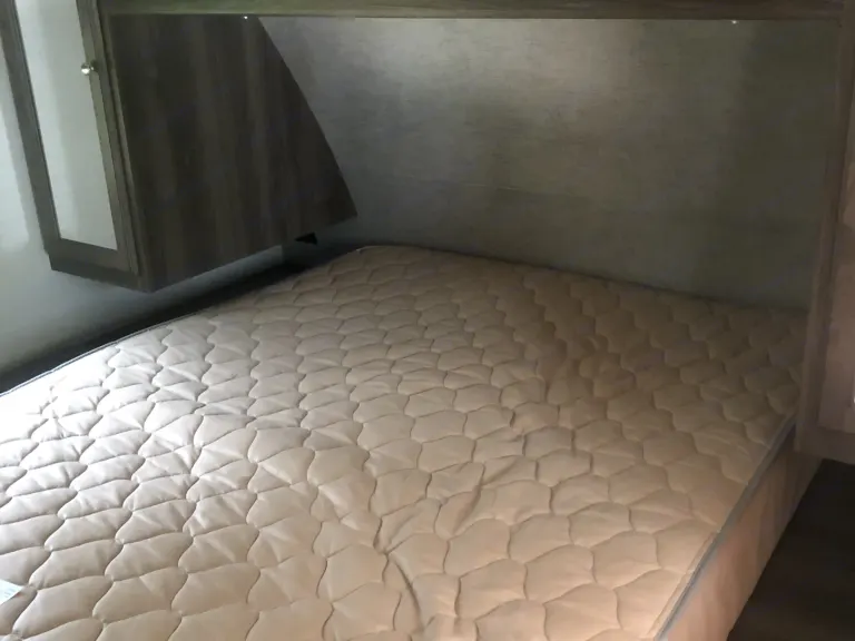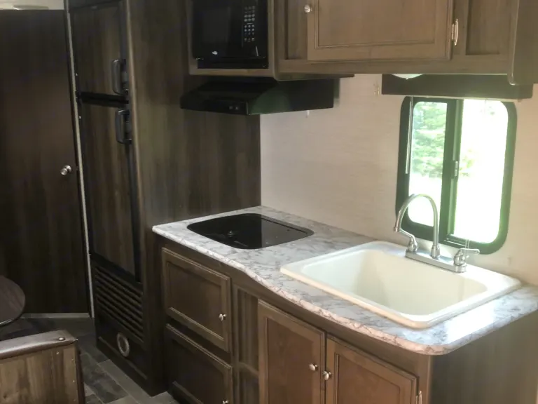 Has a new soft start A/C system installed. This removes the “jumping” of the camper as the compressor kicks on so you can sleep soundly at night. Additionally when using a eco-generator is uses less fuel since it will not cause a large power draw. The last benefit of this is that you can power the A/C off a 20a household breaker!