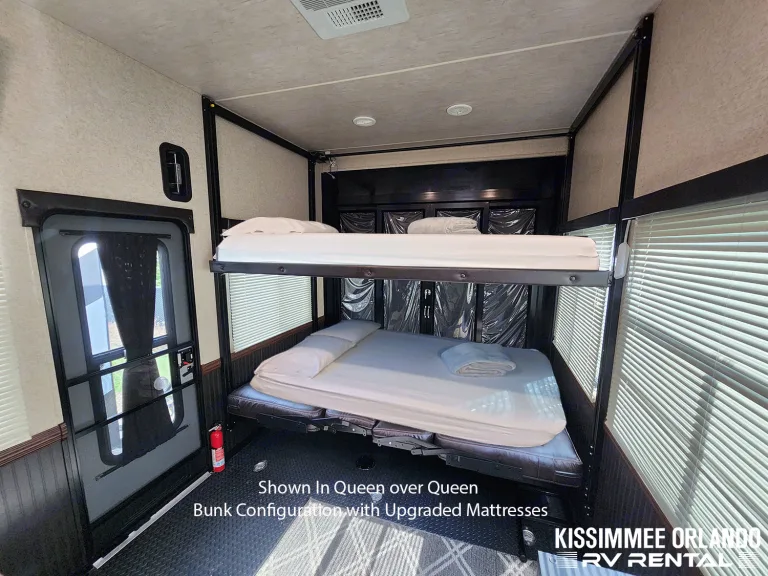 - Over 45 RVs to choose From! Fully Stocked and Ready For Your Camping Adventure!Whether you're embarking on a long-weekend trip or an extended camping adventure, the Cyclone 4115 is geared up to meet your every need and more. This super-sized Cyclone 4115 fifth wheel with Flex-Room features 2 bedrooms, 1.5 baths and lots of space for your family and friends to enjoy. A queen main bedroom up front with premium Sleep Number mattress, rear flex-room with two queen bunks and half-bath plus a twin size loft comfortably sleeps up to 7. The unique rear Flex-Room offers versatility and can be set up for your stay however your prefer. Choose from three different configurations: 2 queen size beds (bunks), Queen upper bunk with two sofas and table, or have an empty room space for special uses like a temporary office space or rec room. Get your family and friends together and experience the Cyclone 4115 for the ultimate level of comfort and amenities which will sure to please just about everybody!Your fully-outfitted RV rental will include everything you'll need for a relaxing time like pillows and bedding for all sleep areas, premium towels, paper products, pots, pans, flatware set, cutlery set, coffee maker, toaster, blender, rice cooker/veggie steamer, broom with dust pan, cleaning supplies/garbage bags, plus much more. Let us deliver, set-up, and all you have to do is show up and enjoy! Reserve your Cyclone 4115 Fifth Wheel camper today!Only Kissimmee Orlando RV Rental offers an assortment of accessories to enhance your RV vacation experience and make camping-life even more awesome. Many add-on items like golf cart rentals, bicycles, pop-up tents, coolers and such are available for any of our RV's and you will be provided a complete accessory list with your reservation confirmation.Delivery / Pick-UP*We want you to have the best vacation with the least to worry about. Delivery, Set-up and Pick-Up in Orlando & Kissimmee, and surrounding areas is available! For your comfort, please make sure full hookups (water, sewer & 50 amp electric) are available at your campground of choice. We do not allow dry camping.Special events (Nascar, Concert events, etc) have minimum stay requirements.View our full lineup of Camper Rentals and RV Rentals!