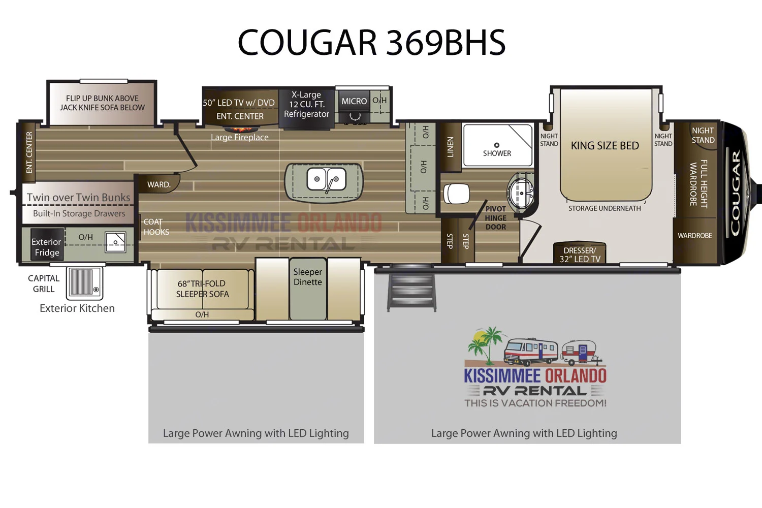 Why rent anywhere else? Kissimmee Orlando RV Rental gives you the Best campers with the Most free amenities and Greatest customer service! RV rental isn't a side-gig for us, this is what we do!This awesome family-friendly rig features 4 slide-outs which creates very spacious living area for the entire family! The king-size master bedroom is up front (upgraded with gel-memory foam) and the fully stocked kitchen with living area is centrally located. The living area features a large and plush tri-fold sofa sleeper, 50" HD TV with DVD Player and stereo system with inside and outside speakers, and large electric fireplace. At the rear is the spacious bunk-room that can sleep 5 with 3 twin bunks and a full-size sofa sleeper.For the outside, you've got two large power awnings ready to give you some shade from the Florida sun!. Built-in LED lighting will light up the campsite. An outdoor kitchen with sink, refrigerator and built-in grill makes this the perfect camper for your outdoor adventure! Just set up the included outdoor chairs and now you're camping!From our smallest camper to our biggest Fifth Wheels and Motorhomes, Kissimmee Orlando RV Rental offers the most fully-equipped and complete rentals in the business. We coined the phrase "Just bring your toothbrush" and we mean it! All our RV and camper rentals include:- New firm-support mattresses with the added comfort of premium gel memory foam, hypo-allergenic mattress and pillow protectors, 100% premium cotton down-alternative bedding, 100% cotton sheet sets with extra sets, medium-firm pillows, extra fleece blankets. All linens are professionally sanitized for each guest.