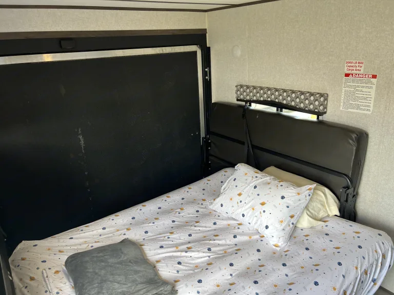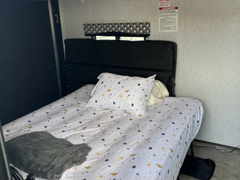 Meet Thunder! This spacious tow hauler travel trailer is great for families with little ones or friends traveling together! This unit can sleep 4 adults or 2 adults and 4 kids comfortably. The master bedroom has a queen bed and lots of closet space! The rear bedroom has 2 couches that convert into full beds. The U-shaped dinette also converts to a full bed. The kitchen features a gas stove, an oven, fridge/freezer, double sink, and lots of storage. The entertainment center includes a TV, stereo, CD player, and radio. Bathroom features a sink, shower, and toilet. My favorite feature about Thunder is the Free golf cart included in the price!! No need to spend $70 a day renting the basic green cart from Disney when one with sweet wheels is included.**This unit is delivery only, no self haul!**