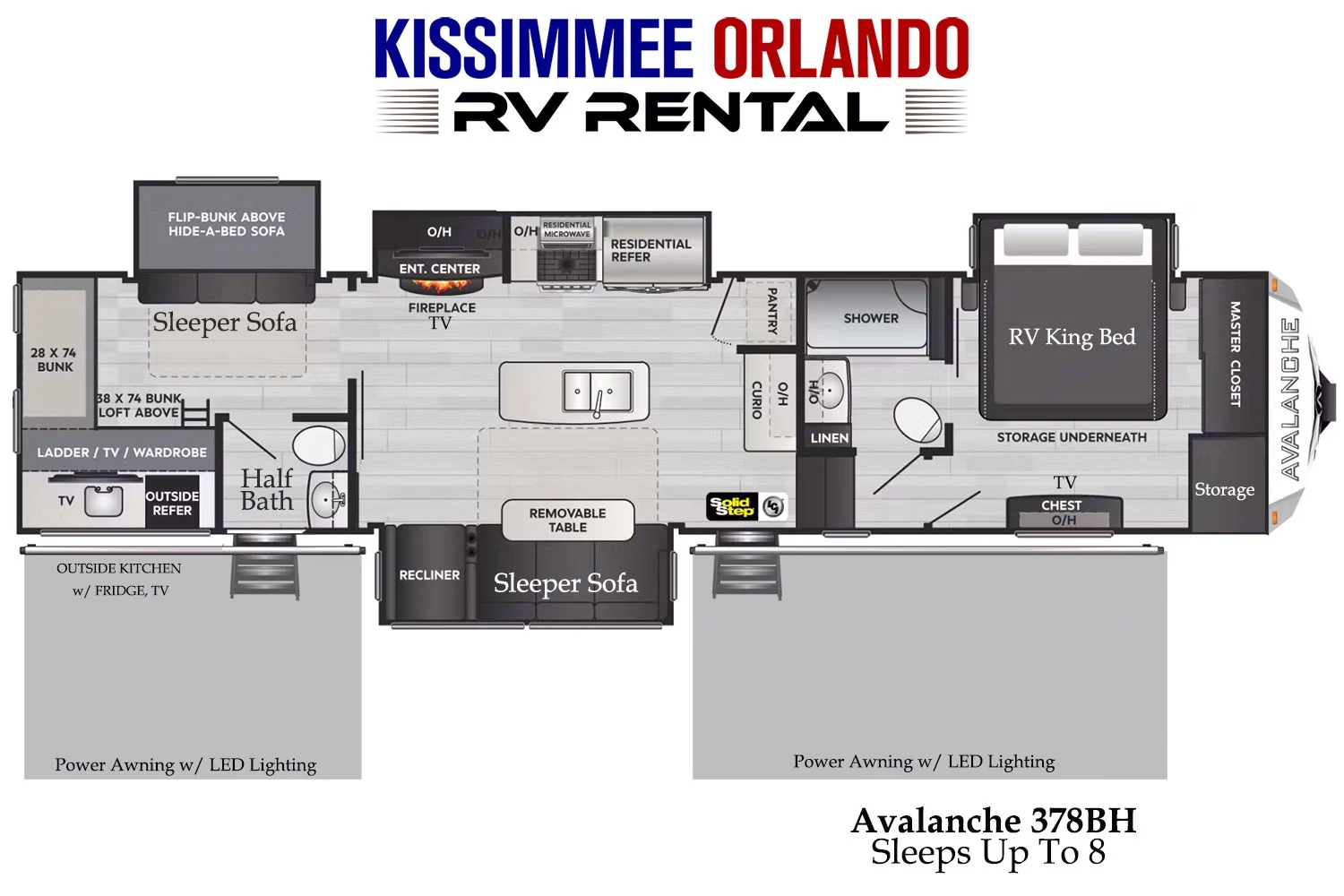 Take on the wilderness in the luxurious Avalanche 378BH! This awesome Bunkhouse Fifth Wheel features an incredibly spacious floorplan which can sleep up to 9! Your family and friends will enjoy the spacious & beautiful open living area with a large seating area and dinette, plus a 43” HD TV with DVD player and electric fireplace. A wonderful space for the entire family to relax in after a great day of outdoor activities. The Avalanche 378BH also offers up a gourmet kitchen including a 20 cubic-foot residential refrigerator, large pantry and dual-bowl sink in the kitchen island. Sleep areas include a king bedroom with large bathroom up front, bunkhouse bedroom with sleeper sofa plus half-bath in the rear, sofa sleeper in living area and sleeper dinette. Outside, your camping adventure gets kicked up a notch with a large outside kitchen, TV, refrigerator and grill!Your fully-outfitted RV rental will include everything you'll need for a relaxing time like pillows and bedding for all sleep areas, premium towels, paper products, pots, pans, flatware set, cutlery set, coffee maker, toaster, blender, rice cooker/veggie steamer, broom with dust pan, cleaning supplies/garbage bags, plus much more. Let us deliver, set-up, and all you have to do is show up and enjoy! Reserve your Avalanche 378BH Fifth Wheel today!Only Kissimmee Orlando RV Rental offers an assortment of accessories to enhance your RV vacation experience and make camping-life even more awesome. Many add-on items like golf cart rentals, bicycles, pop-up tents, coolers and such are available for any of our RV's and you will be provided a complete accessory list with your reservation confirmation.Delivery / Pick-UP*We want you to have the best vacation with the least to worry about. Delivery, Set-up and Pick-Up in Orlando & Kissimmee, and surrounding areas is available! For your comfort, please make sure full hookups (water, sewer & 50 amp electric) are available at your campground of choice. We do not allow dry camping.Special events (Nascar, Concert events, etc) have minimum stay requirements.View our full lineup of Camper Rentals and RV Rentals!