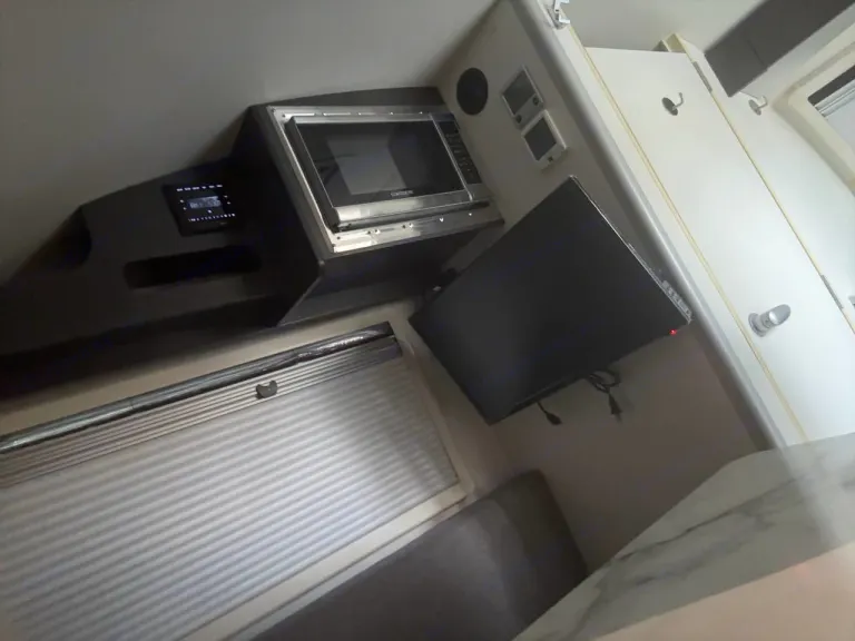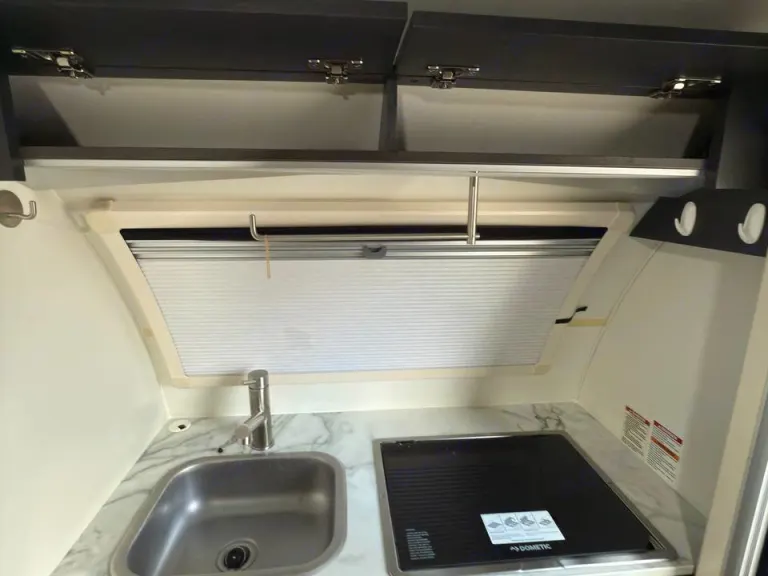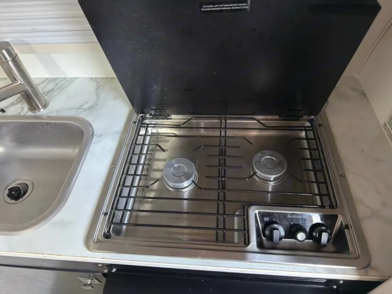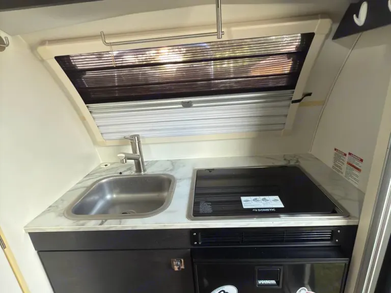 • Galley kitchen: 2-burner stove, stainless sink, 12V fridge, and ample storage.