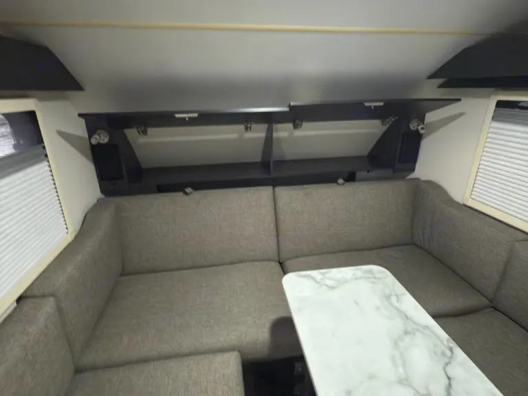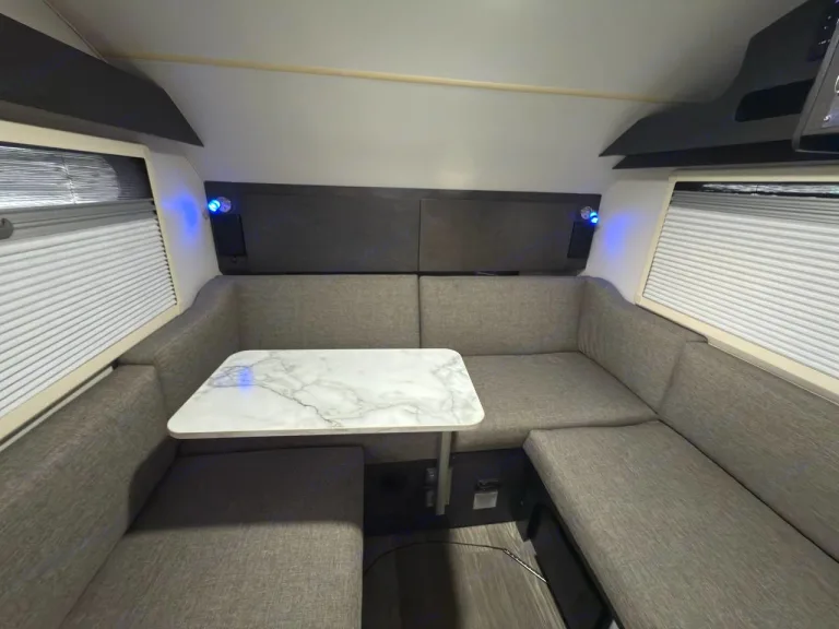 • Spacious U-shaped dinette converts to a large 71” x 72” queen bed (sleeps 2 adults + one kid comfortably – plush and private).
