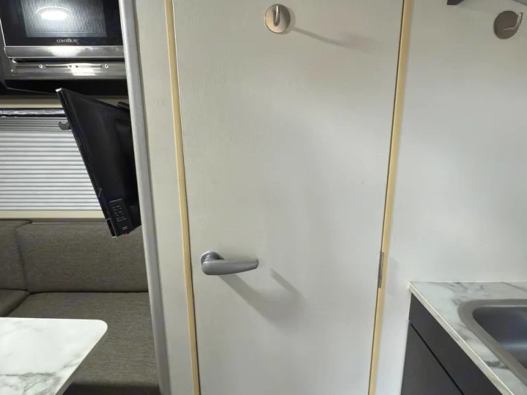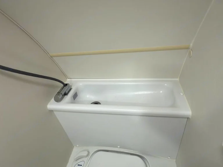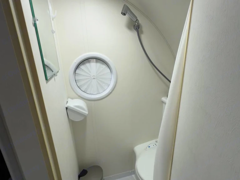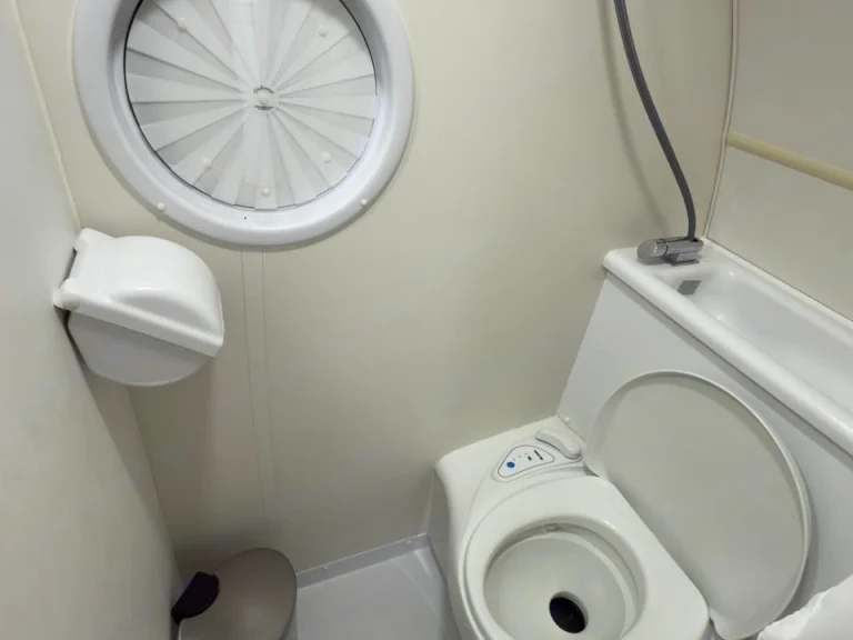 • Full wet bath with cassette toilet, sink, and hot shower.