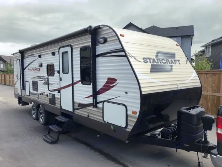 32' travel trailer with a residential feel! Like new condition and ready to be enjoyed by up to 10 family and friends! Includes a private bedroom with a large mattress and fully closing doors. Bunk beds, pull out couches, this trailer has sleeping for 10! All the conveniences of home with lots of storage and a Huge slideout to give you that open concept feeling. Both an outdoor and indoor shower, sink, fridge, freezer, surround speakers, bathroom, this trailer has everything you need! Book today to get your dream trip underway :)