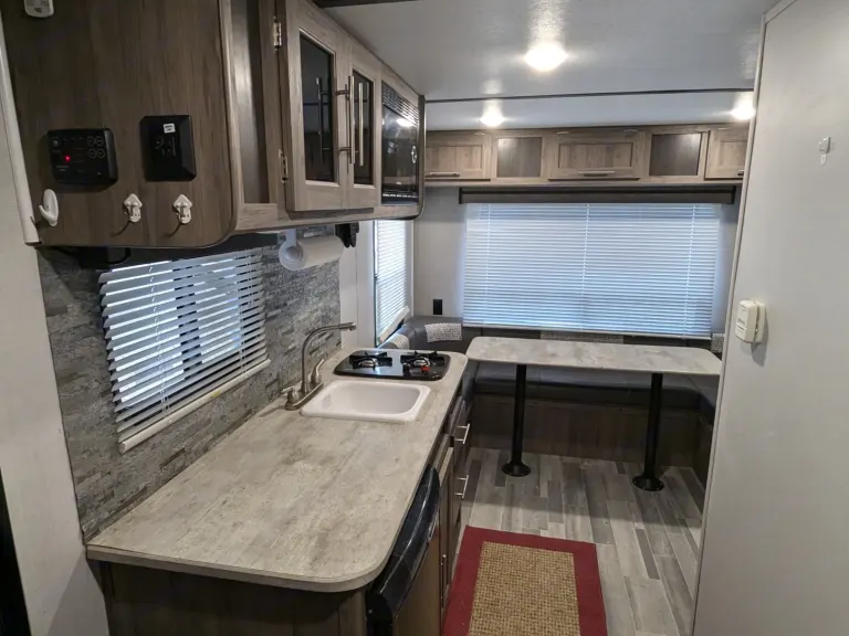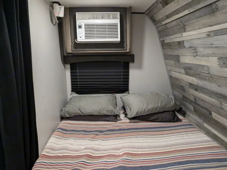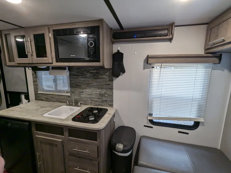 21 foot camper available for rent for EAA. Has a queen bed with dividing curtain and dinnete which can convert to a bed. Sink/stove/microwave/fridge and bathroom with shower, toilet and sink. On-demand propane hot-water heater along with electric and water hookups and city water tank. Has inverters to run off batteries as well. Can be brought to site for fee.Other things to noteNo smoking, pet friendly