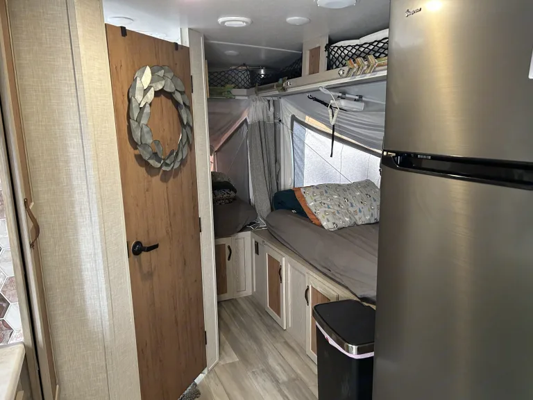 Enjoy the allure of tent camping with all of the amenities of a travel trailer. Three queen size beds (with heated mattress) fold down to get you closer to nature. U-shaped dinette and fold out couch for additional sleeping.Kitchen includes a large fridge and microwave, stovetop, and oven for any type of cooking you want to do.Avoid pit toilets and middle of the night walks to the bathrooms, as this rig has a bathroom and a large shower that you can actually use comfortably.Equipped with solar panels and an inverter so you can camp off the grid, or on a non-electric site.Other amenities include: TV, stereo with CD/DVD, built in wifi booster, water filtration, outdoor griddle, outdoor shower, and A/C for those hot summer days.What's includedFree delivery within 20 miles of Oshkosh (will credit $60 to delivery outside of 20 miles).Bring your bedding, and just about anything else you would need for staying in this is included: utensils, dinner ware, cook ware, coffee maker, toaster, etc. Anything else? Just ask! We probably have it available.Generator is available for rent at an additional cost. We can supply bedding for all beds for a $50 fee to cover laundromat costs.Plan on just packing your clothes, food, and toiletries.Recommendations• EAA, Lambeau Field, Life Fest, Winnebago County Fairgrounds, High Cliff