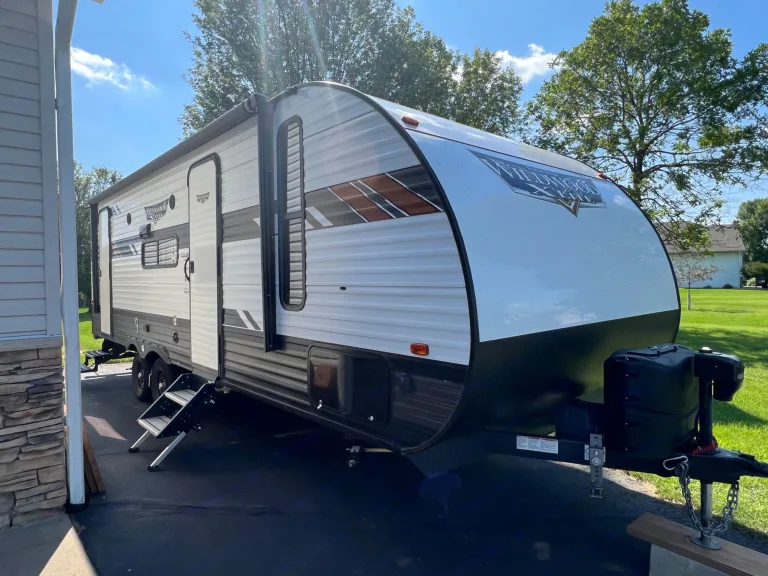 This 29 foot 2020 Forest River Wildwood camper features 3/4 bathroom (shower, toilet, and sink), full kitchen, 1 dinette/bed slide out, full bunk beds, a 50" smart television and blu ray player, pantry, private bedroom with a queen bed, small closet spaces, and 32" smart television, wifi extender, electric simulated fireplace/heater, cupboards, and so much more. In excellent condition! What's includedCamping chairs, basics for cooking (cooking utensils, etc). RecommendationsWe have taken our camper to the Black Hills, SD, Yellowstone National Park, Grand Tetons National Park, Theodore Roosevelt National Park, Maplewood State Park in MN, Itasca State Park in MN, and other smaller campground sites around MN and WI. Other things to noteNo pets, no smoking, no tailgating, no festivals, etc. You will need a brake controller, be able to pull 5300 lbs dry weight, and have a 7 blade electrical hookup to rent. Please expect to spend around 20-45 minutes for departure due to walk through and instructions of camper (this is required by Outdoorsy).