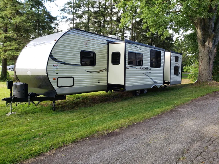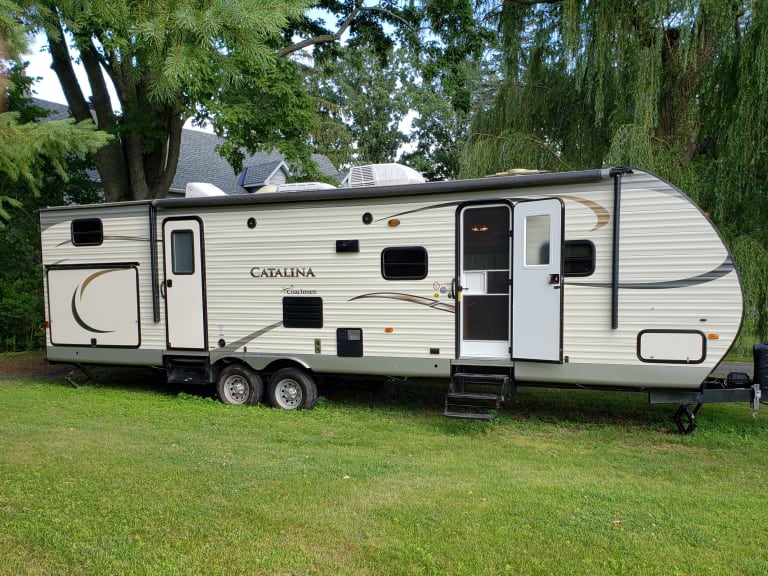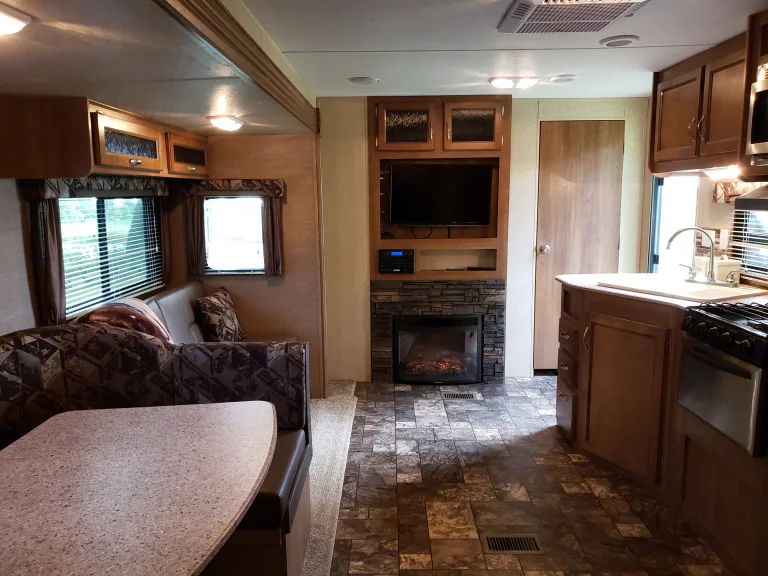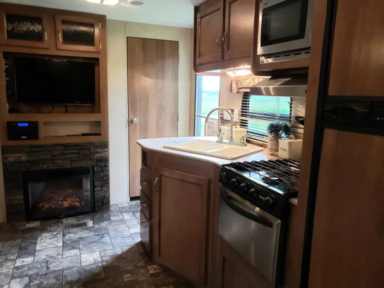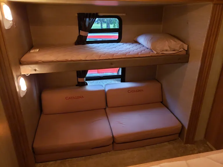 Immaculately maintained family trailer sleeps up to ten. Includes separate queen master bedroom and bunkhouse. Full kitchen, bathroom with shower, TV/DVD/CD with outdoor speakers, power awning with mood lighting, A/C, electric fireplace, outdoor kitchen and more.