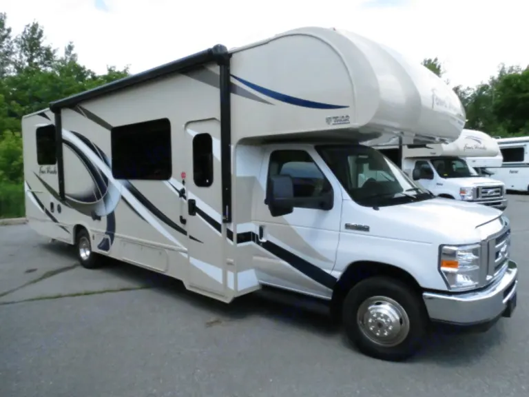 Step up your next camping trip with the Four Winds 31Y class C motor home by Thor Motor Coach. This model features a single slide out and plenty of sleeping space for your whole family! Above the cab area you will find a cab-over bunk with a sleeping space of 54" x 96". Along the door side of this model there is a dinette, a 40" LED TV, and an overhead cabinet. The side aisle bathroom has a sliding door which adds more privacy, a 30" x 36" shower, a sink, extra counter space, a toilet, plus an overhead cabinet. Along the road side there is a large slide out which features a sofa with seatbelts and an overhead cabinet. At night the sofa easily converts into a 40" x 70" sleeping area. Continuing along the slide out there is an angled double sink, a three burner range with an overhead microwave, a refrigerator, a pantry, and in the bedroom there is a closet for your hang up clothes. At night pull closed the folding door for more privacy in the rear room. Here you will find a queen bed, two closets, and a 32" LED TV along the wall that is shared with the bathroom.Winter Rentals- Our rental units will be winterized as of October 15th.