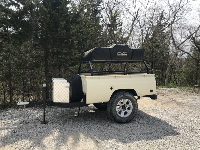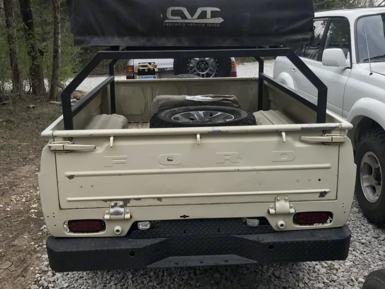 70’s Ford Truck bed build with custom frame, high clearance axle and large tires. Has shocks so you can take it with you to remote camp spots with out even knowing it’s behind you. 3 jack points to level and firm it up so it’s not moving around and shacking in the wind.2” ball hitch and 7 pin electrical connector.Can possibly include camp gear and inflatable Mattress to fit the annex room to expand capacity. 2 person tent full size double foam tent mattress. Queen inflatable for the annex.