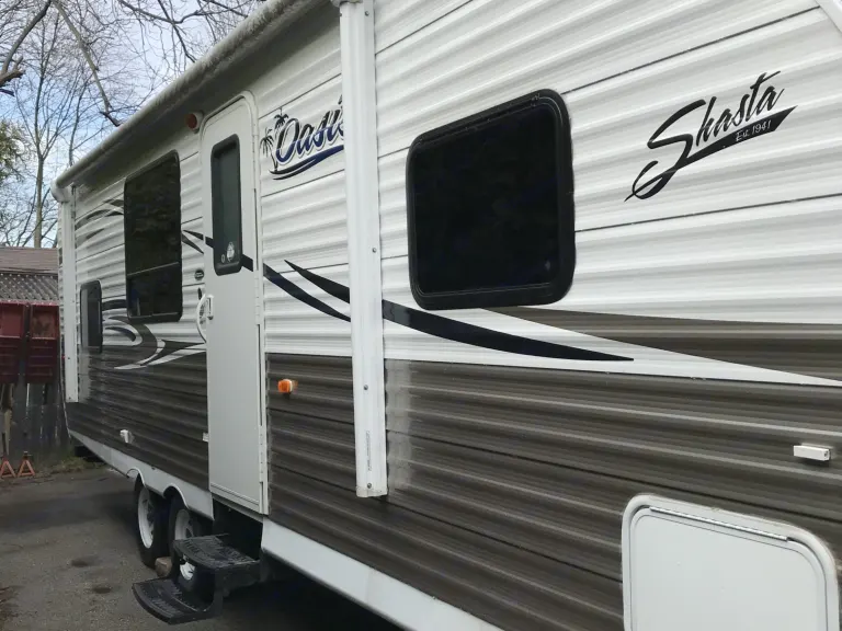 Beautiful, easy towing 26' bunkhouse trailer(30' overall). Great for families with young kids. Get all the amenities of home while making memories with your family. Two Double bunk beds, Queen bed, table folds down into a double bed and a futon for sleeping. Hitch has torsion bars for better towing. Has a big electric awning making it an easy set up. Has furnace and A/C. Comes with all the kitchen supplies, and bedding. Delivery available to campgrounds only. Towing vehicle must have 7 pin connector and trailer brakes, WE Will NOT allow trailer to be towed without proper brakes! customers will still be billed if they show up without proper towing brakes/connector!