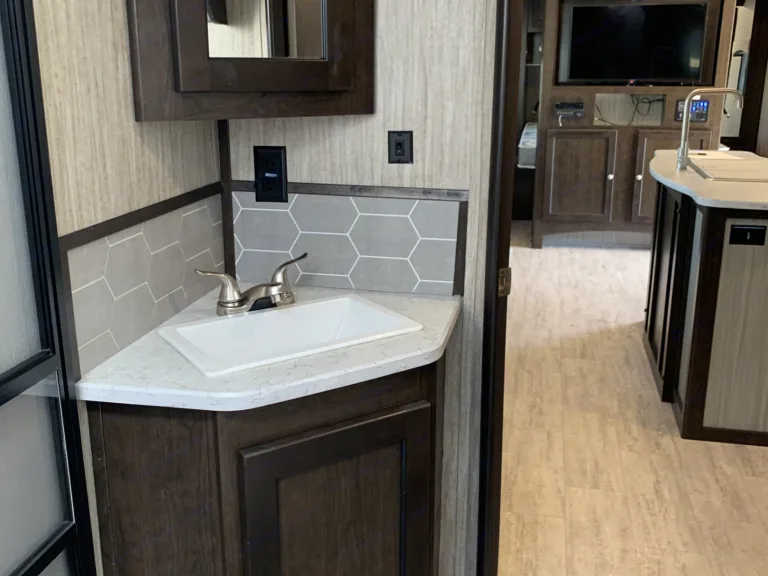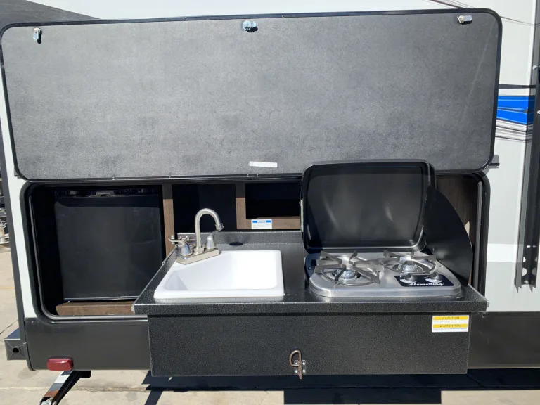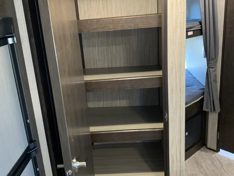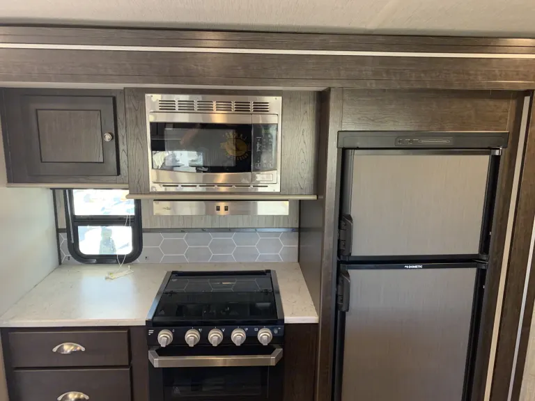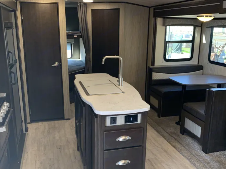 The open-concept living area is made possible because of the two slides that have been included in this trailer giving you the space you need to gather together with the family each night for dinner, and the double bunk beds and queen-size bed in the front, private bedroom allow this unit to sleep nine people once the evening has come to an end. Because this trailer comes with two entry/exit doors, you can directly enter the rear bathroom so that you can get back to enjoying your outdoor adventure quicker.