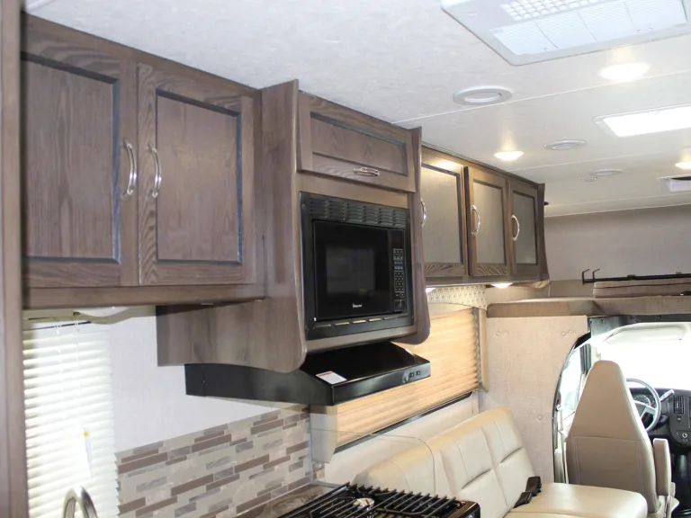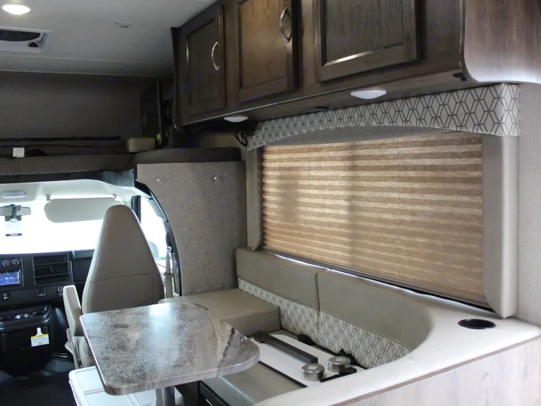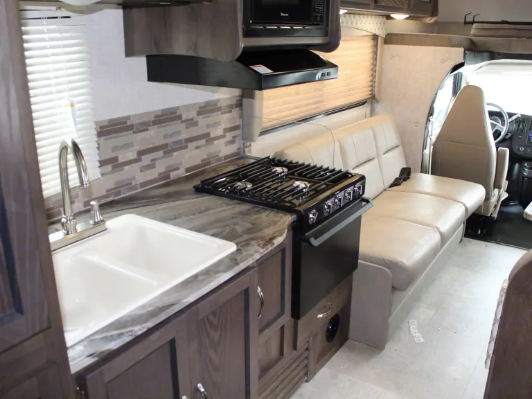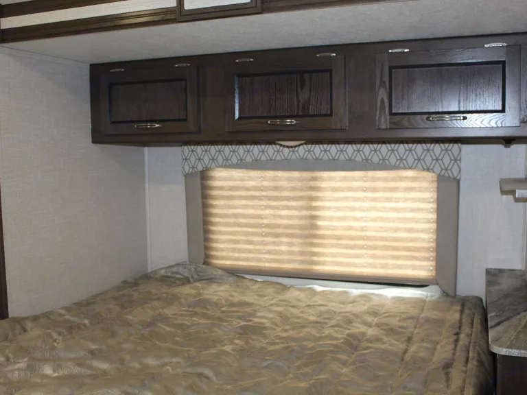 he 95 X 57 cab over offers complete usable space for storage or sleeping. In the living room you will find a 42 X 77 J-Sofa that can be utilized in five different ways; wrapped J corner for a comfortable chair, J-Sofa, J-Sofa with table, converts into a booth dinette and of course, it can make into a bed. Directly across from the J-Sofa will be a 62 jack knife sofa for additional seating. The fully equipped kitchen has a straight counter-top which creates a nice open walk way and floor space inside the motor home. The bedroom offers a 60 X 80 walk around queen bed with a large rear window and a large wardrobe to handle your hanging clothing needs. The corner bath is located next to the bed and offers a walk in shower. The outside storage is second to none, with a large luggage door for easy access to the main storage compartment for all of your camping items and a second luggage door for convenient access as well.The Motorhome is expected to be returned in the same clean condition in which you receive it. If you don't return it in the condition in which it is received an additional $120 cleaning fee will be added.