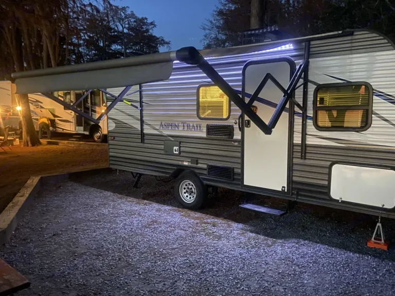 This trailer provides plenty of sleeping space for five with the bunk beds, queen-size bed, and folded down booth dinette! The private bathroom allows everyone to get dressed and cleaned up before heading outdoors to watch the game, feed the animals, or hike around the park. You will also find full kitchen amenities and storage for everyone's gear. From the 13,500 BTU air conditioner, interior LED lighting, and upgraded residential flooring to the microwave and galley sink with high-rise faucet, you will never miss out on any of your favorite features from home.What's includedComes with linens, cookware, silverware, coffee maker, outdoor folding chairs and outdoor mat.