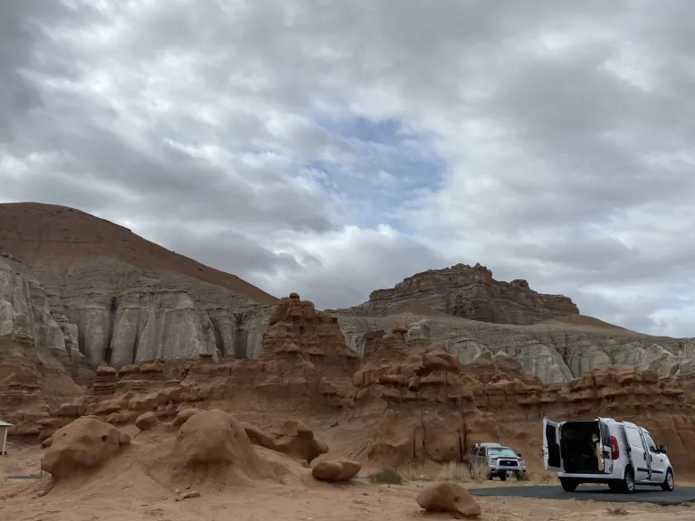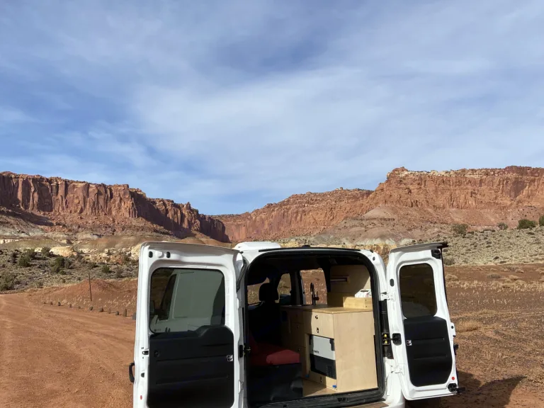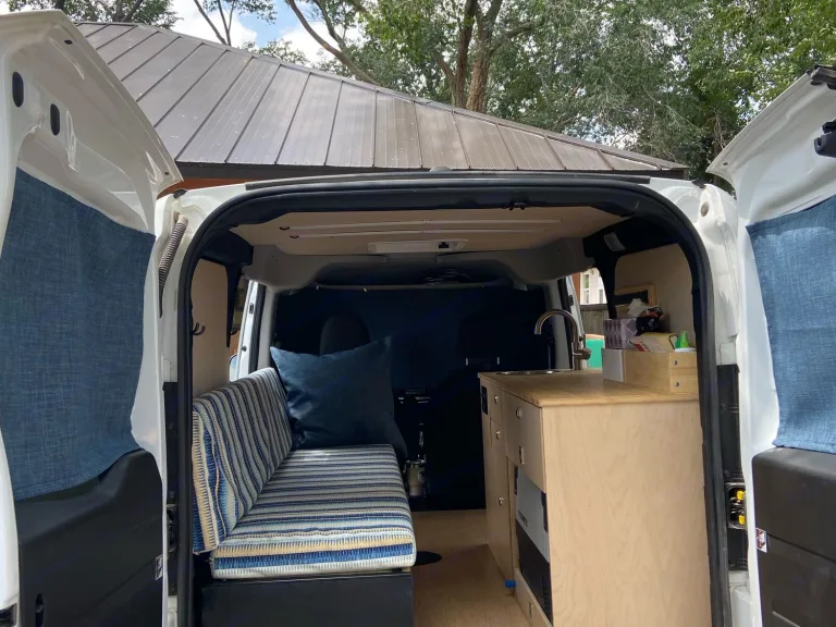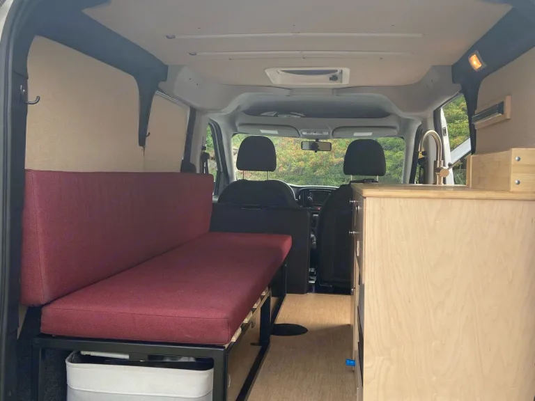 The van is up-fitted with a standard bed, ceiling fan, fridge, sink, and storage drawers. Sleep soundly in this insulated and sound proofed van. A Solar panel and shore power hook up offer power options for charging electronics and running the sink/fridge/fan.EPA city/highway fuel economy: 21/28 mpgWhat's includedSofa bed converts to standard bed. Dimensions are: 34 W X 72 LSink with electric water pumpPrivacy window covers providedDometic cooler fridgeDrawers for storageFan with three settingsCamp chair (1)Electrical outlets and USB portShore power outlet for electrical hookupsSolar Panel**A Pelican 70 QT elite cooler is available to rent for an additional fee.Other things to noteNo off-roading. This is front wheel drive with low clearance.Absolutely no cooking inside the van. Outdoor cooking only. Do not burn anything inside the van including incense, candles, and citronella.The Dometic fridge must be connected to shore power or solar power to cool properly.Bring your own bedding.No smoking near the van.The van will be cleaned and sanitized prior to renting.