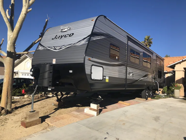 Brand New 2021 Jayco 5th wheel. Enjoy your next adventure to your scenic adventure. Sleeps 7 to 14 great for the entire family plus guests. King size Serta mattress (medium firm). Perfect for the kids, which includes bunk beds and 2 cushioned seats that convert into single beds. Equipped with pots and pans, blender, bowls, collapsible dish rack and tons of storage space underneath for all of your adventure gear.The furniture is beautiful and you can rotate the TV/Mirror to face the master bedroom or the living room. Also equipped with an outdoor sink, mini refrigerator and stove.What's includedPots and pans