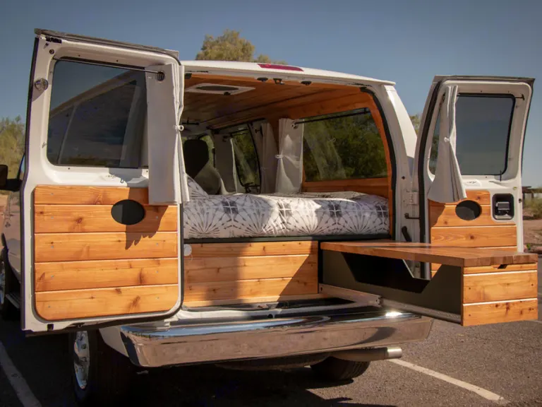 This Camper Van is perfect for on or off-grid camping! This boho styled camper van is located among many beautiful destinations for the perfect outdoor adventure.The 2-panel solar system allows all build-out components to run independently of the alternator with a battery system providing 210 AH of off-grid power. Run the roof fan, power your gadgets with the inverter, run your sink/outdoor shower and set the perfect lighting ambiance with plenty of power to spare. No shore-power is necessary, so go off grid and skip the hook-ups!This camper van also has a 48” rear pull-out butcher block cooking station, a butcher block counter kitchenette, vinyl flooring and red cedar paneling with dimmable ambient lighting.Design and Build by Boho Camper Vans.Fury friends are welcome!What's included-Fresh linens + 2 pillows