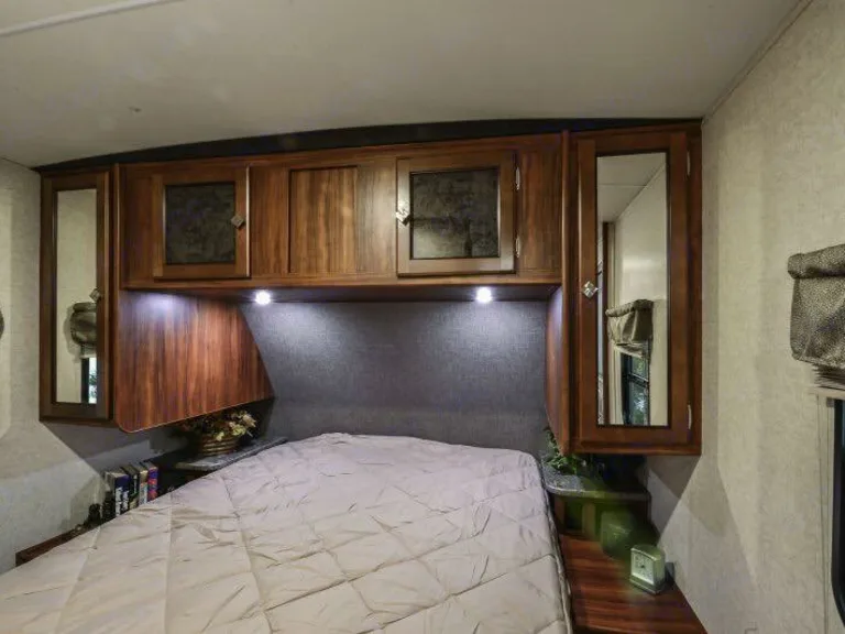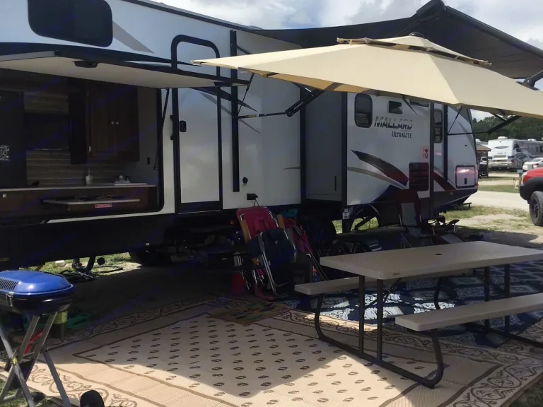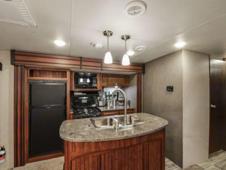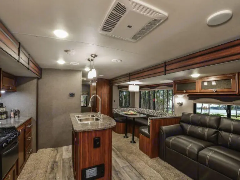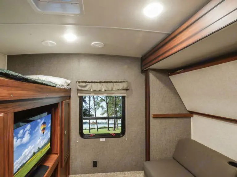 3 bunks, 2 full propane tanks, 3 slides, master with door. Outdoor kitchen, 35’ long. Canopy with led lights attached.It’s a dream to camp in this RV. The ride is smooth and easy. Sleeps 10 comfortably. Nice and roomy. Kitchen has an island sink. Plenty of windows to let in the natural light. A swivel tv for family watching or late night watching in the master suite.Please Note: Black and Gray water tank labels are backwards. What's includedBoogie boards, camping chairs, cooking supplies. Patio rugRecommendationsAlways connect to the 50 amp breakers.