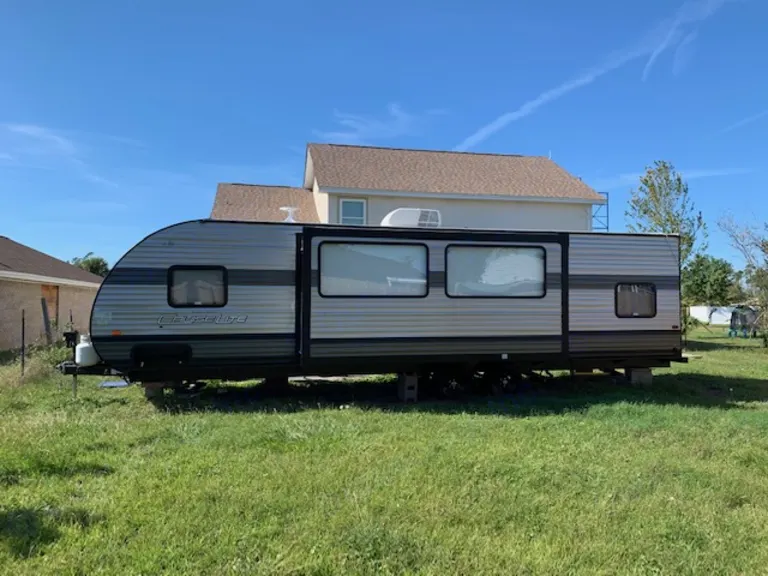 My family and I were displaced after Hurricane Michael and were forced to purchase a travel trailer to reside in during the rebuild. This became our second home and some good memories were made inside. Now that we've been able to move back into our home, we hope to share this beauty, so that other families can create wonderful memories too!The bedroom is private with its own door, a queen size mattress, half closets with the ability to hang clothes, under bed storage, and a smart TV hanging in the bedroom corner.Kitchen is fully stocked with place setting for four (plates, bowls, cups, utensils), pots and pans, and other basic kitchen supplies. Also provided are a 12-cup coffee maker with coffee.Bathroom is equipped with full-size toilet, sink and shower. Plenty of storage throughout for longer stays. Spare/guest/kid/animal room in back with three bunks and a couch that converts to a "bed." Dining room table can seat 4-6 comfortably and also converts to a "bed." Couch in living room also converts to "bed." Living room equipped with TV, faux-fireplace, radio/CD/USB player.Linens provided upon request. What's includedExtras can be provided, depending. Please send message and discuss with owner. RecommendationsPerfect for traveling any place with a view! The picture windows in the living/dining areas are perfect for viewing water, mountains, beaches, lakes/rivers, etc. Other things to noteAbsolutely no smoking inside trailer.