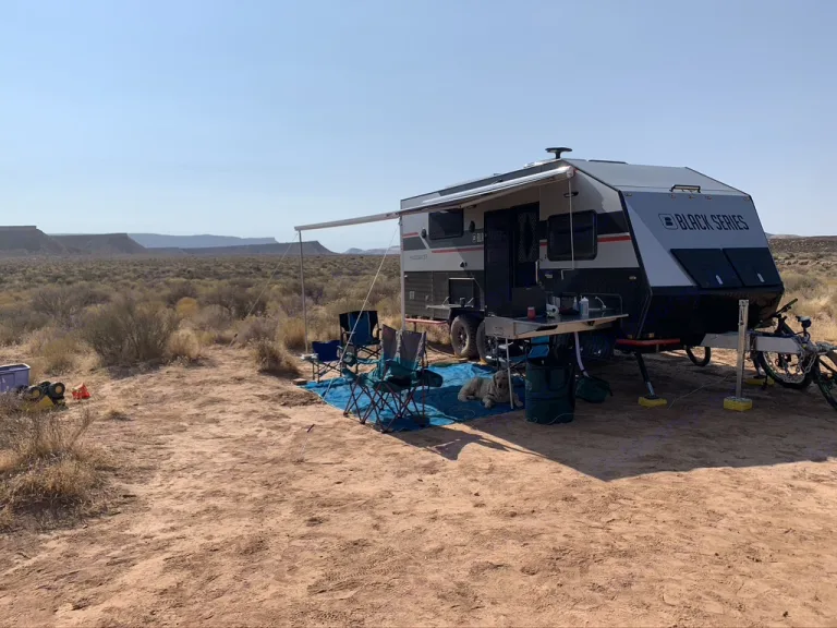 It has the toy hauler area customized to provide more storage and comfortable living, final build is being completed in November 2020. The rear drops and Includes a fold out tent in the rear that increases the 19' living space to 26'. Two bunk beds and a queen bed in the front. High end Victron electrical system with battle-born lithium batteries. rooftop solar and suitcase solar with 3000K Inverter/charger. Also a Honda 2200 generator that operates off the propane as well. 60 gallons fresh water capacity. Nice outdoor kitchen. All necessary basic set-up gear and kitchen ware are included in the rental. Please bring your own sleeping bags, sheet and bedding. Unit is fully disinfected upon return.