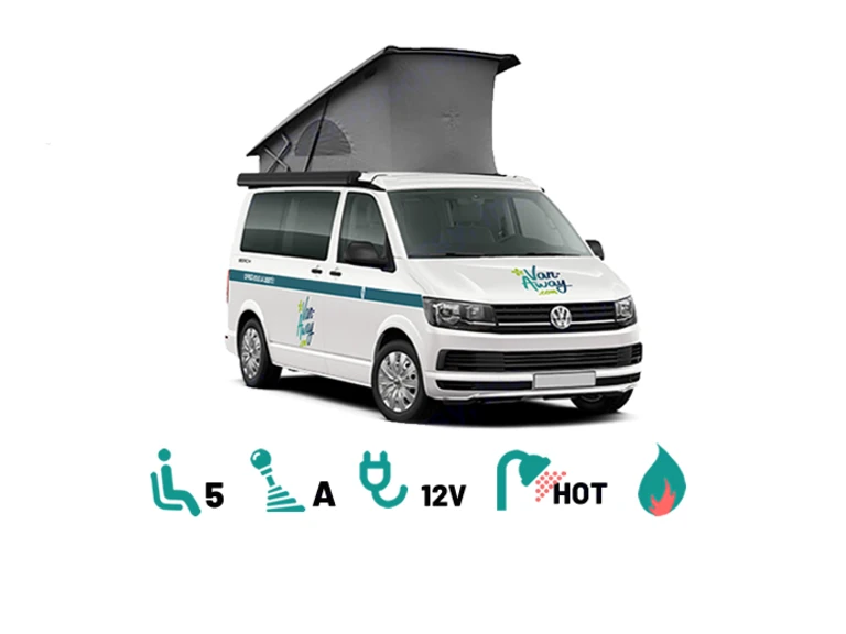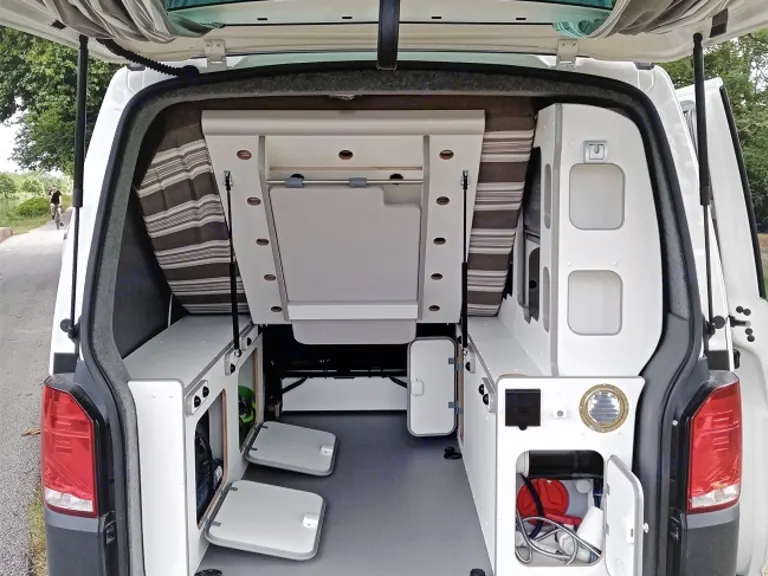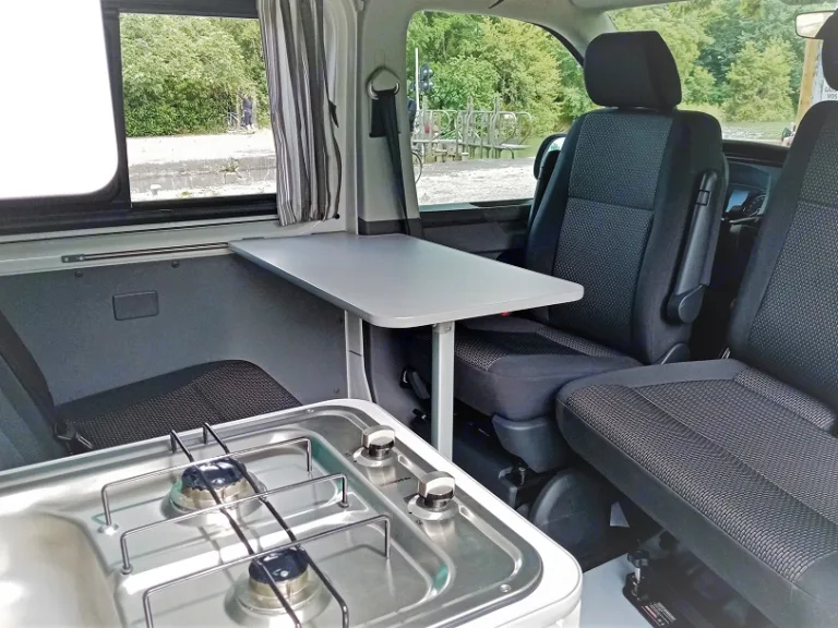 Ce van aménagé vous propose le niveau de confort du California, mais permet de partir jusqu'à 5, avec 2 places pivotantes à l'avant, et une banquette 3 places avec ceintures de sécurité 3 points à l'arrière.